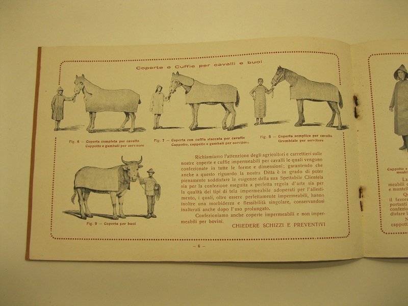 In 16 obl. cm 14,5 x 22, pp. 12 con illustrazioni n. t. Brossura editoriale. Curiose le immagini della produzione di teloni da carro, camion e motoscafo, impermeabili per militari e grembiuli per stallieri, capelli da marinaio, combinazioni complete per cacciatori ecc.