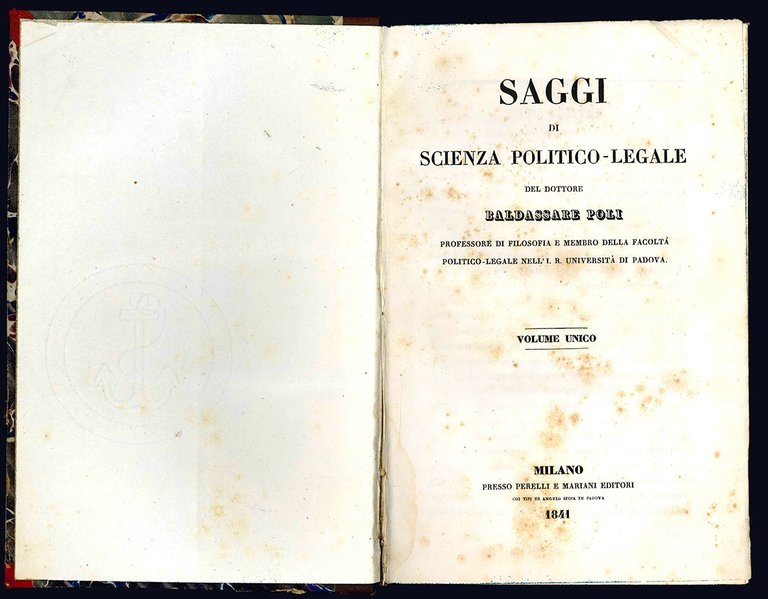 Saggi di scienza politico-legale del dottore Baldassare Poli professore di filosofia e membro della facoltà politico-legale nell'I.R. Università di Padova. Volume Unico.