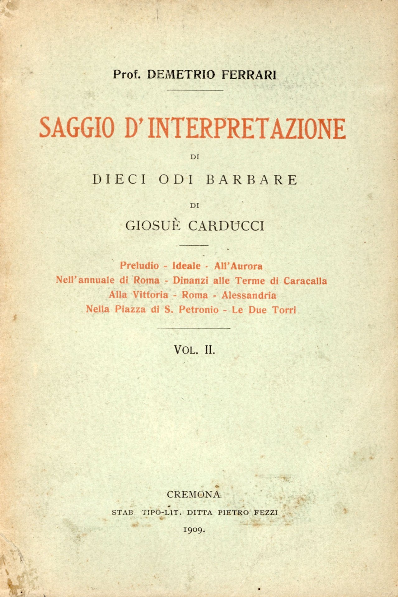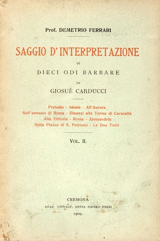 Volume Secondo. Preludio � Ideale � All'Aurora � Nell'annuale di Roma � Dinanzi alle Terme di Caracalla � Alla Vittoria � Roma � Alessandria � Nella Piazza di S. Petronio � Le Due Torri. 851 � Ba In Ottavi (15-23cm ) Buono (Good) Buono