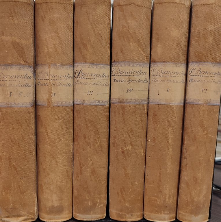 Saint Bonaventure. 6 volumi. Opera usata proveniente da collezione privata. Le copertine riportano evidenti tracce d'uso, sul primo tomo etichetta. Le pagine risultano imbrunite dal tempo e con evidenti fioriture. Timbri di appartenenza su tutti i tomi. Polvere e fioriture ai tagli. Quinterni allentati Polvere ai tagli. in ottavo 4.500 Buono (Good) Opera usata proveniente da collezione privata. Le copertinae riportano evidenti tracce d'uso, sul primo tomo etichetta. Le pagine risultano imbrunite dal tempo e con evidenti fioriture. Timbri di appartenenza su tutti i tomi. Polvere e fioriture ai tagli.