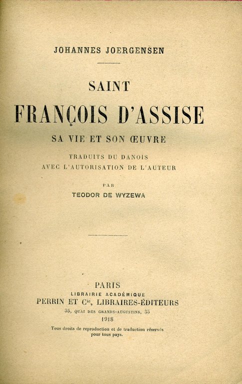 In lingua francese, 536 pagine. Ritratto del santo in antiporta. Traduzione di Teodor de Wyzewa. 200 � Ba Buono (Good) Buono