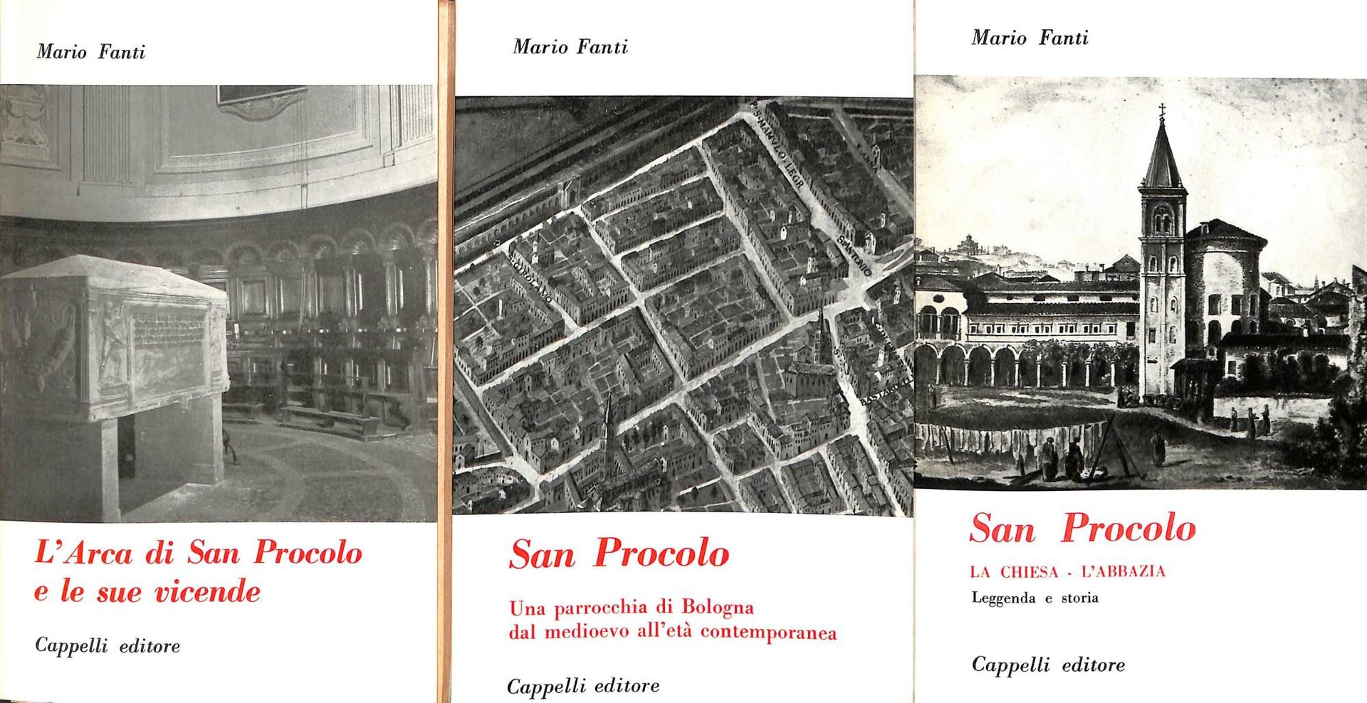 Confanetto contenente le ristampe anastatioche, dell'edizione 1961, dei seguenti volumi di Mario Fanti: 1) San Procolo: una parrocchia di Bologna dal medioevo all'età cantemporanea. 2) L'arca di San Procolo e le sue vicende. 3) San Procolo: la chiesa - l'abbazia, leggenda e storia. 726 LOC - Ba