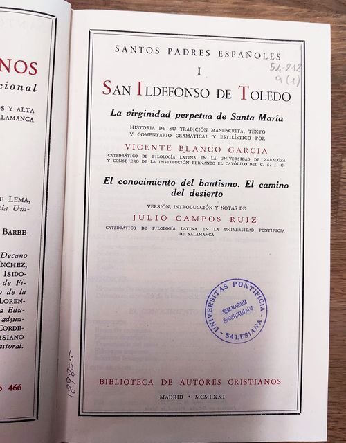 SANTOS PADRES ESPANOLES. I: San Ildefonso de Toledo: La Virginidad perpetua de Santa Maria. Historia de su Tradicion Manuscrita, Texto y Comentario Gramatical y Estilistico. El conocimiento del bautismo. El camino del desierto