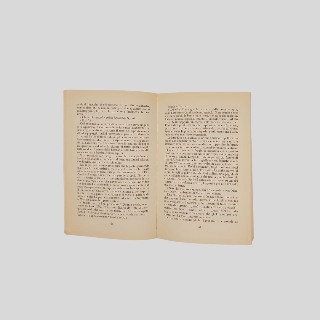 In-16°(cm 19), pp. 137 [5]. Collana Gli Elefanti. Lievi tracce d’uso alla copertina, internoin buone condizioni. Romanzo breve ambientato fra i travestiti di Napoli. «La vicenda presenta la Ricerca dell’Amore Assoluto dal punto di vista della protagonista, la napoletanissima femmenella Rosalinda Sprint, cacciata ahimè di casa quando aveva confessato d’essere “ricchione”, che si prostituisce un po’ per necessità, un po’ per gusto. Un personaggio che può contare sulla secolare tolleranza napoletana verso i “femminelli”, ben inserito nella vita del quartiere in cui vive e circondate di amiche/rivali, “femmenelle” anche loro, dai nomi altrettanto improbabili. L’opera è un delirio camp gay incrociato con il gusto iperbarocco di Napoli: una miscela fatale da cui risulta una protagonista, e un mondo, esagerati in quanto travestiti, ed esagerati al cubo in quanto travestiti e per di più napoletani. In mani poco esperte ne sarebbe uscito un pastrocchio razzista e omofobo. Viceversa, Patroni Griffi riesce a darci un ritratto al tempo stesso toccante e divertente di Rosalinda, mentre insegue amori impossibili per maschiacci mascalzoni napoletani che la usano ma la disprezzano (e la derubano pure).<BR>“Divertente”, perché in fondo le sciagure affettive di Rosalinda Sprint sono dovute (oltre che alla sua condizione di femmenella, quindi per definizione outsider dell’amore) anche alla sua mania di esagerare sempre: trovato infine un amante fisso che la vuole con sé, un inglese della base Nato di Napoli, è Rosalinda che manda all’aria tutto presentandosi come una star, laddove l’amante (sposato) le aveva raccomandato discrezione.Insomma, una protagonista, un mondo, una città esagerati per un romanzo deliberatamente esageraaaato. E godibilissimo». [Cfr. Giovanni Dall’Orto],