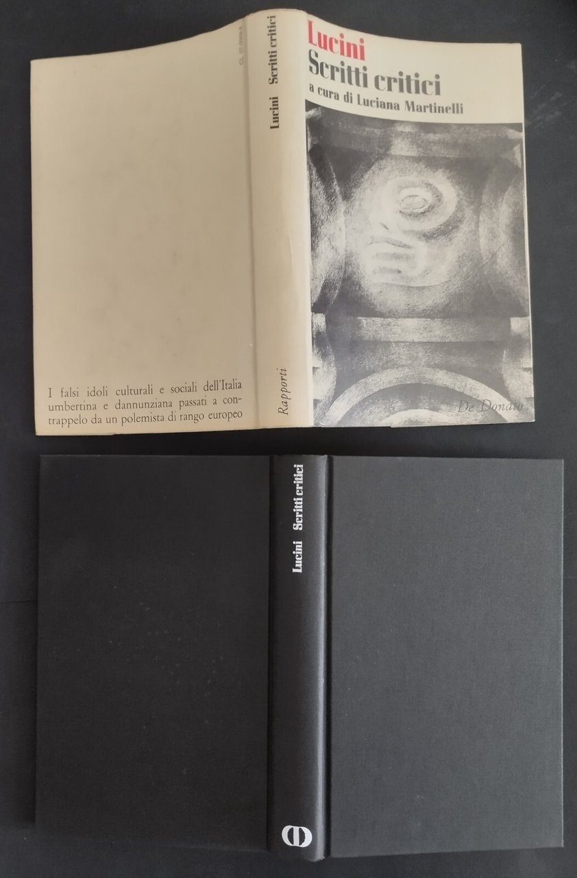 SCRITTI CRITICI DI GIAN PIERO LUCINI a cura di Luciana Martinelli. De Donato Editore, 1971 . LXIV, 336 pagine. Copertina editoriale in tutta tela con sovraccoperta. Stato di conservazione: molto buono (pagine normalmente ingiallite) Libro usato saggistica letteraria italiana