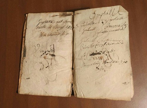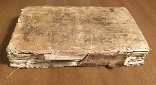 Stato di conservazione: accettabile (copertina fortemente sciupata con mancanze al dorso, scritte e macchie varie ai piatti, scritte e pasticci antichi alle guardie, firme di appartenenza, fioriture, testo comunque perfettamente leggibile)