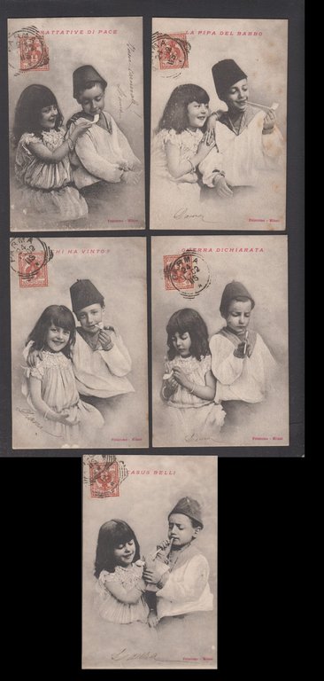 Serie completa di 5 cartoline litigio tra bambini per una pipa 1902 vg