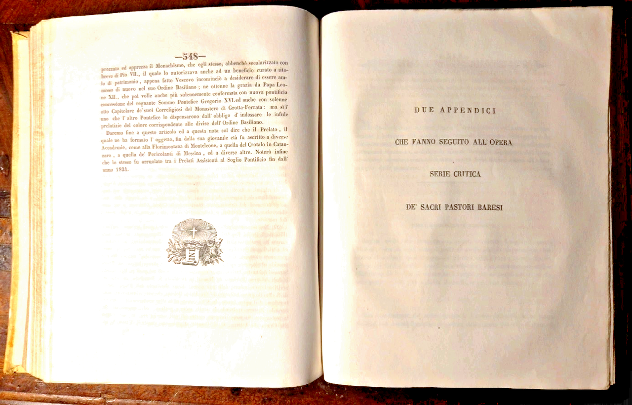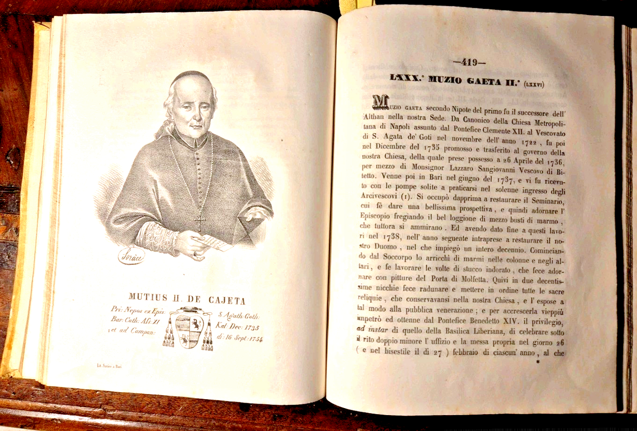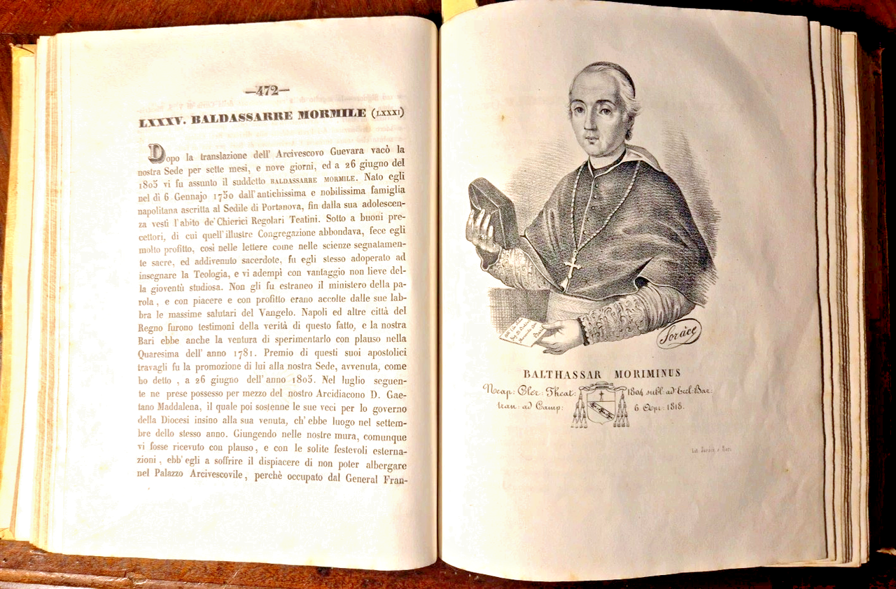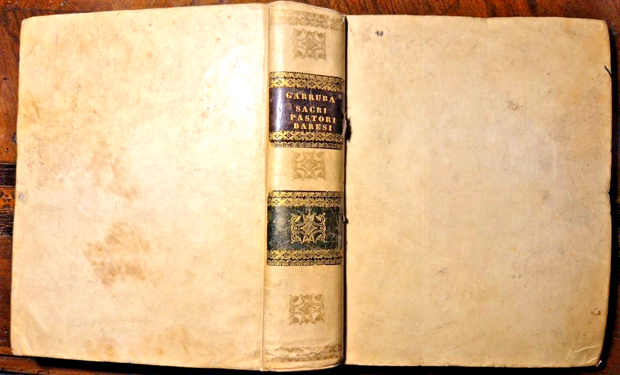 Bari, Tipografia Fratelli Cannone, 1844. (2), 1008, (2) pagine, 7 incisioni con ritratti fuori testo, vignetta al frontespizio e finalini. Elegante copertina in tutta pergamena con titoli e fregi dorati entro tasselli al dorso. Dimensioni: 19 x 24,5 cm. Stato di conservazione: OTTIMO (pagine eccezionalmente fresche, piccolissime mancanze ai tasselli sul dorso, pieghe alla prima e ultima pagina) Serie critica de' Sacri Pastori Baresi è un'opera monumentale di Michele Garruba, pubblicata nel 1844 presso la tipografia fratelli Cannone a Bari. Il volume, che supera le mille pagine, rappresenta una delle fonti più complete e critiche sulla successione dei vescovi e arcivescovi della Chiesa di Bari, fornendo anche ritratti litografici e stemmi dei prelati. L'opera nasce dall'esigenza, avvertita sia dall'autore sia dall'allora arcivescovo di Bari, di colmare una significativa lacuna storica: la mancanza di una cronologia critica e documentata dei pastori baresi. Infatti, come sottolinea Garruba nella prefazione, antichi documenti e cataloghi (come i dittici della Chiesa barese e il catalogo del Frignano, poi Papa Urbano VI) erano andati dispersi, lasciando la sede episcopale priva di una memoria storica organica. Garruba adotta un approccio critico e comparativo:Analizza e confronta le fonti disponibili, segnalando discrepanze e proponendo correzioni basate su documenti d’archivio e cronografi locali.Per i periodi più antichi, dove la documentazione è scarsa a causa di persecuzioni e perdita di manoscritti, si limita a riportare i nomi noti, ringraziando gli studiosi che hanno permesso di conservare almeno queste informazioni25.Aggiunge note esplicative e polemiche per confutare opinioni non fondate su dati certi.Libro antico storia locale Bari