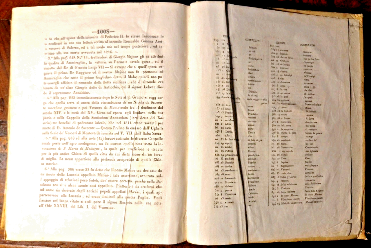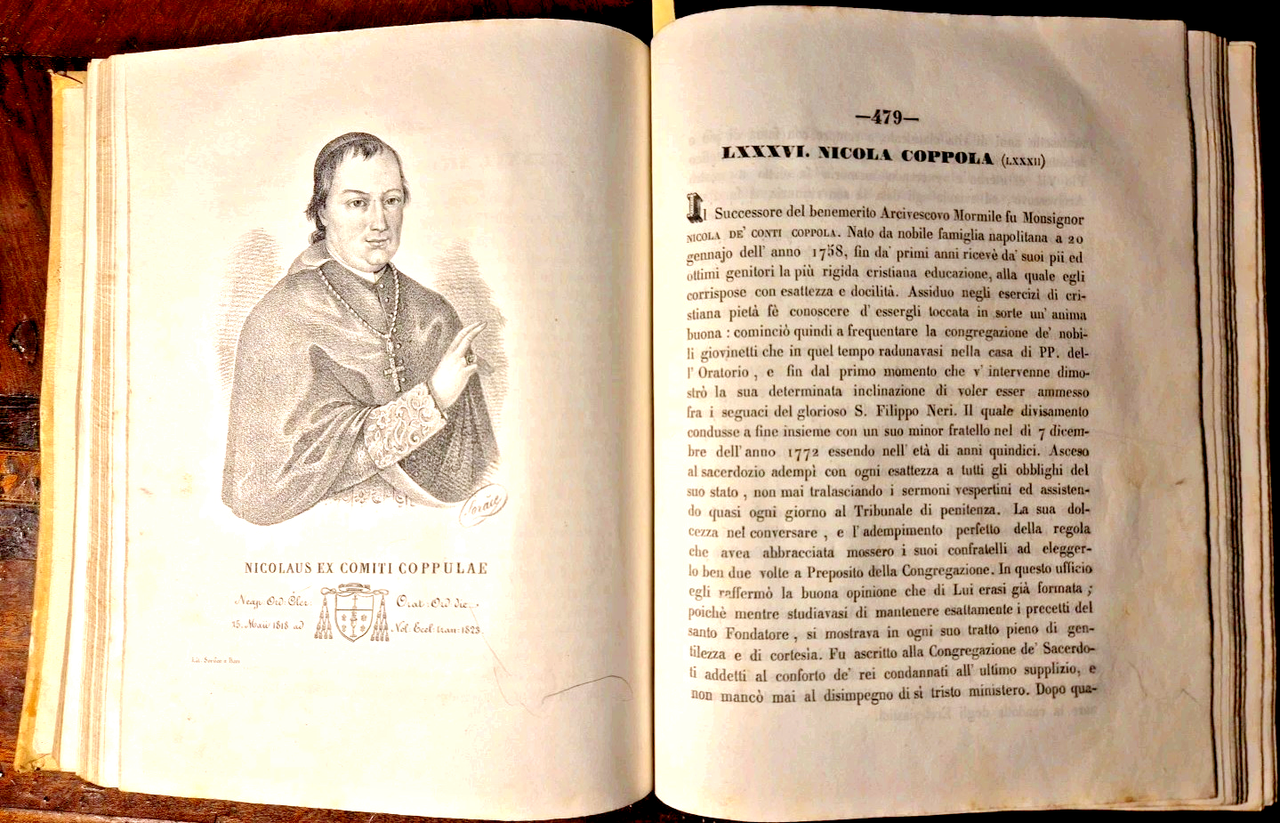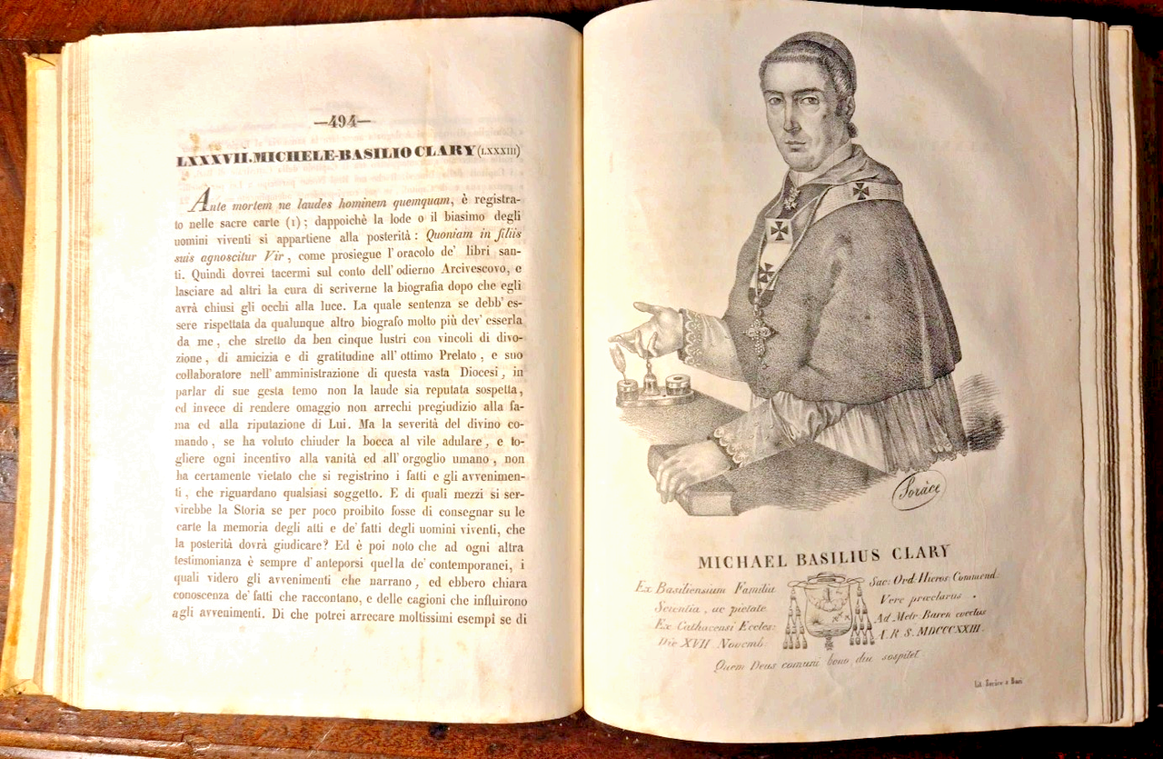 Bari, Tipografia Fratelli Cannone, 1844. (2), 1008, (2) pagine, 7 incisioni con ritratti fuori testo, vignetta al frontespizio e finalini. Elegante copertina in tutta pergamena con titoli e fregi dorati entro tasselli al dorso. Dimensioni: 19 x 24,5 cm. Stato di conservazione: OTTIMO (pagine eccezionalmente fresche, piccolissime mancanze ai tasselli sul dorso, pieghe alla prima e ultima pagina) Serie critica de' Sacri Pastori Baresi è un'opera monumentale di Michele Garruba, pubblicata nel 1844 presso la tipografia fratelli Cannone a Bari. Il volume, che supera le mille pagine, rappresenta una delle fonti più complete e critiche sulla successione dei vescovi e arcivescovi della Chiesa di Bari, fornendo anche ritratti litografici e stemmi dei prelati. L'opera nasce dall'esigenza, avvertita sia dall'autore sia dall'allora arcivescovo di Bari, di colmare una significativa lacuna storica: la mancanza di una cronologia critica e documentata dei pastori baresi. Infatti, come sottolinea Garruba nella prefazione, antichi documenti e cataloghi (come i dittici della Chiesa barese e il catalogo del Frignano, poi Papa Urbano VI) erano andati dispersi, lasciando la sede episcopale priva di una memoria storica organica. Garruba adotta un approccio critico e comparativo:Analizza e confronta le fonti disponibili, segnalando discrepanze e proponendo correzioni basate su documenti d’archivio e cronografi locali.Per i periodi più antichi, dove la documentazione è scarsa a causa di persecuzioni e perdita di manoscritti, si limita a riportare i nomi noti, ringraziando gli studiosi che hanno permesso di conservare almeno queste informazioni25.Aggiunge note esplicative e polemiche per confutare opinioni non fondate su dati certi.Libro antico storia locale Bari
