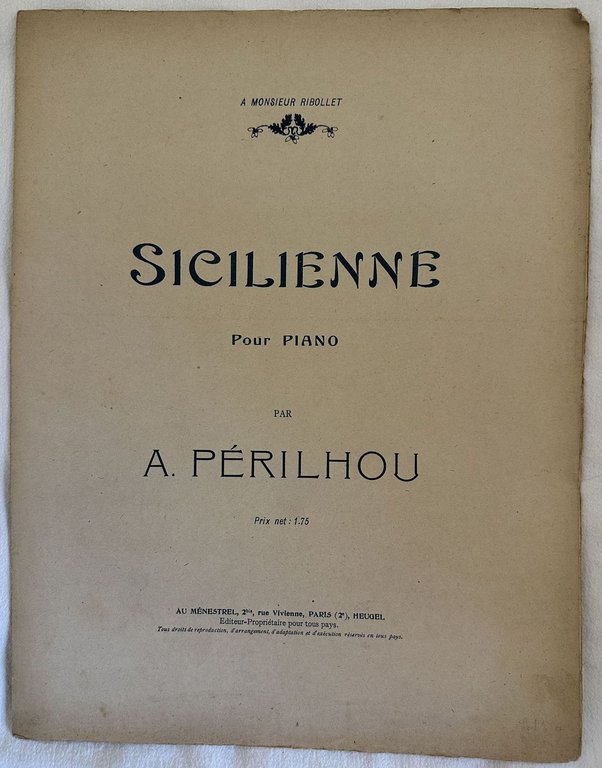 Edizione del 1920 della melodia "Sicilienne" del compositore francese Albert Jacques Perilhou (1846-1936). In buone condizioni. Copertina editoriale in buone condizioni con lievi usure marginal. Legatura editorialmente assente. Pagine in buone condizioni con rare fioriture. In 4. cm.35,5x27. Pp. 5.Edition of 1920 of the melodiy "Sicilienne" by the french composer Albert Jacques Perilhou (1846-1936). In good conditions. Editorial cover in good conditions lightly worn in the extremities. Binding is editoriarly missing. Pages in good conditions with occasional foxing.In 4. cm.35,5x27. Pp. 5.