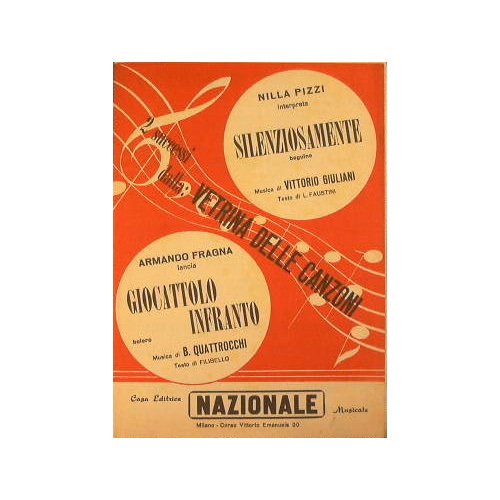 2 Sucessi dalla: Vetrina delle canzoni - Autori: Giuliani Vittorio, Faustini L., Quattrocchi B. e Filibello - Interpretata da Nilla Pizzi - Lanciata da Armando Fragna - in 8° - pp.17 - Brossura editoriale illustrata - Partitura per Pianoforte, Violino/Fisarmonica, Saxofono Contralto, Saxofono Tenore, Tromba e Contrabbasso