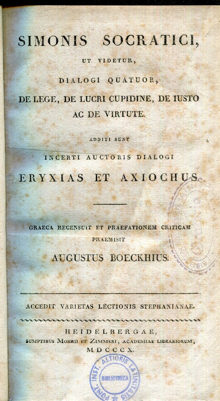 Simonis Socratici ut videtur, Dialogi quatuor, de lege, de lucri cupidine, de iusto ac de virtute. Additi sunt incerti auctoris dialogi Eryxias et Axiochus. Graeca recensuit et praefationem criticam praemisit Augustus Boeckhius. Accedit varietas lectionis stephaniana