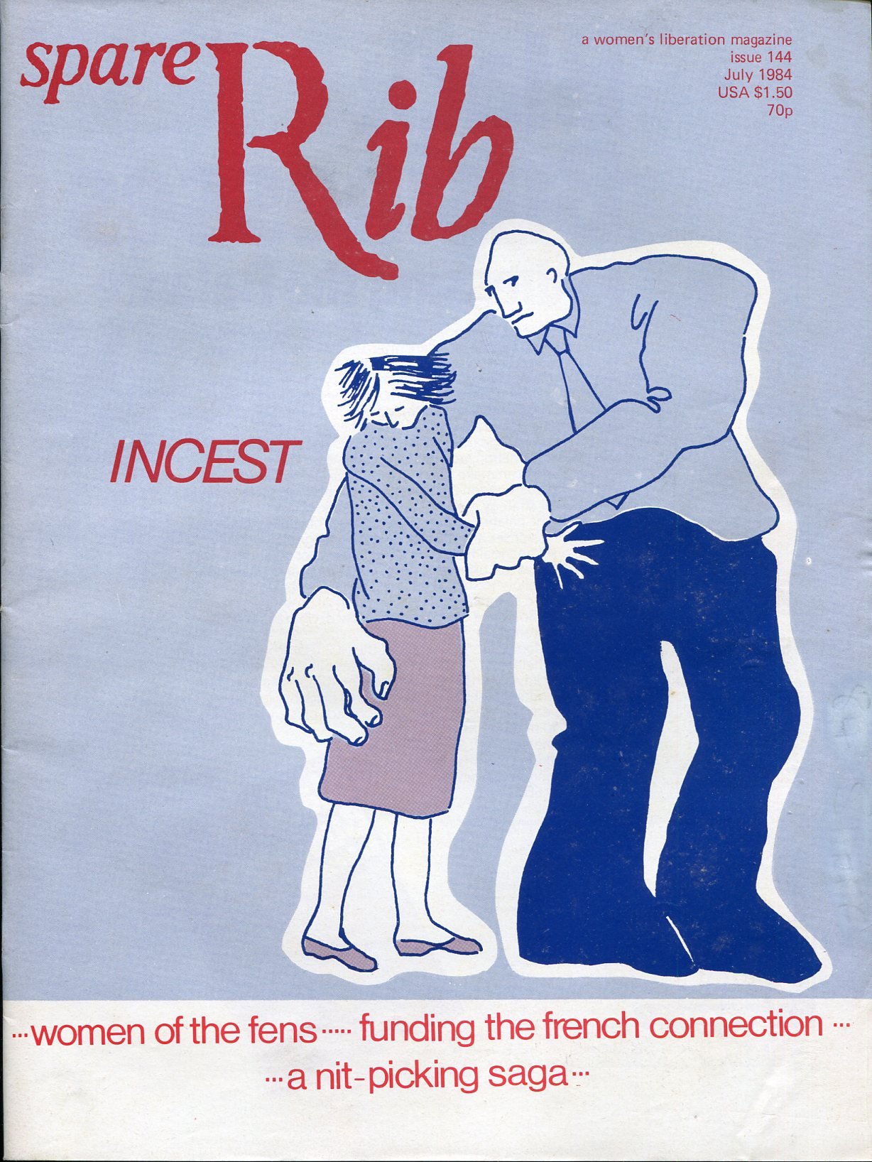 No marks or inscriptions to contents. Slight creasingand foxing to covers. A clean tight copy with slightly rubbed front board and no bumping to corners. 55pp. Feminist magazine covering politics, health, gender roles, women's liberation, sexism, racism, and much more. Includes feature on Incest. Spare Rib magazine of July 1984.