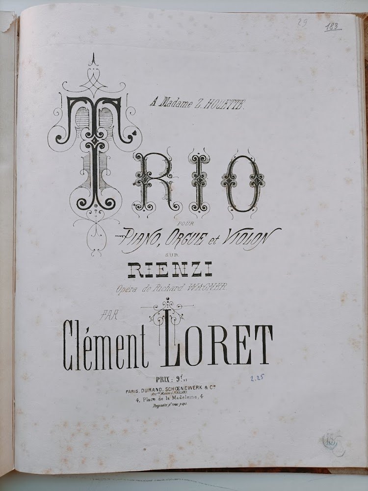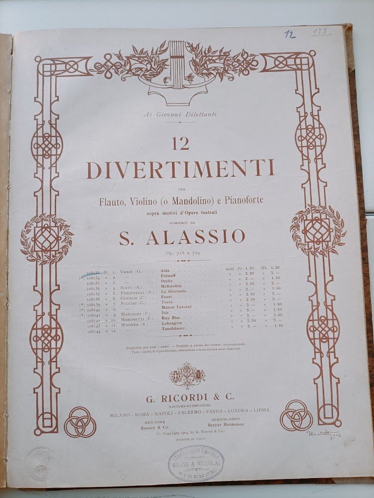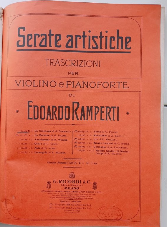 In 4, legatura mezza tela muta con lievi abrasioni ai piatti. Alcuni spartiti presentano rare e leggere fioriture o sono privi della copertina. Il volume comprende: Serate artistiche –Trascrizioni per violino e pianoforte di Edoardo Ramperti, n.1 Ponchielli, La Gioconda, n. 4, Verdi, Otello, n. 5, Verdi, Aida, n. 6, Wagner, Lohengrin, n. 7, Puccini, Tosca, n. 8, Boito, Mefistofele, n. 10, Puccini, Manon Lescaut e n. 11, Franchetti, Germania, Milano, Ricordi, 1903; Puccini, Madama Butterfly atto II solo di Butterfly riduzione V. Mattaress, Milano, Ricoerdi, 1905; Cherubini, Hymne de l'Opera Médée arrangée pour violon et violoncelle avec accompagnement de piano et orgue-melodium par George Goltermann (due copie), Paris, Scholl, s.d.; Puccini, Tosca atto III solo di Cavaradossi riduzione V. Mattaress, Milano, Ricordi, s.d.; D. Alard, Huit fantasies faciles pour violon avec accompagnement de piano, n. 4 Il Barbiere (rinforzo nel margine esterno della copertina), n. 8 La Sonnambula (con rinforzo al margine esterno della cop. Posteriore), Milano, Ricordi, s.d.; 12 divertimenti per flauto, violino (o mandolino) e pianoforte sopra motivi di opere teatrali composti da S. Alassio, n.1 Verdi Aida, Milano Ricordi, s.d.; Wagner, Rienzi trio pour piano, orgue et violon par Clément Loret (due copie), Paris Durand, s.d.; Bellini, I Puritani, Duo brillant pour piano et violon par G.A. Osborne et C. De Beriot, s.l., Pozzi, s.d.; Ch. Gounod, La Reine de Saba Reverie arabe transcrite pour piano, orgue et violon ou voloncelle par l'Auteur Buono (Good) .