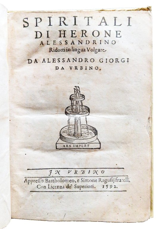 Spiritali di Herone Alessandrino ridotti in lingua volgare da Alessandro Giorgi da Vrbino. | Livres anciens et modernes | Erone, Di Alessandria - Giorgi, Alessandro