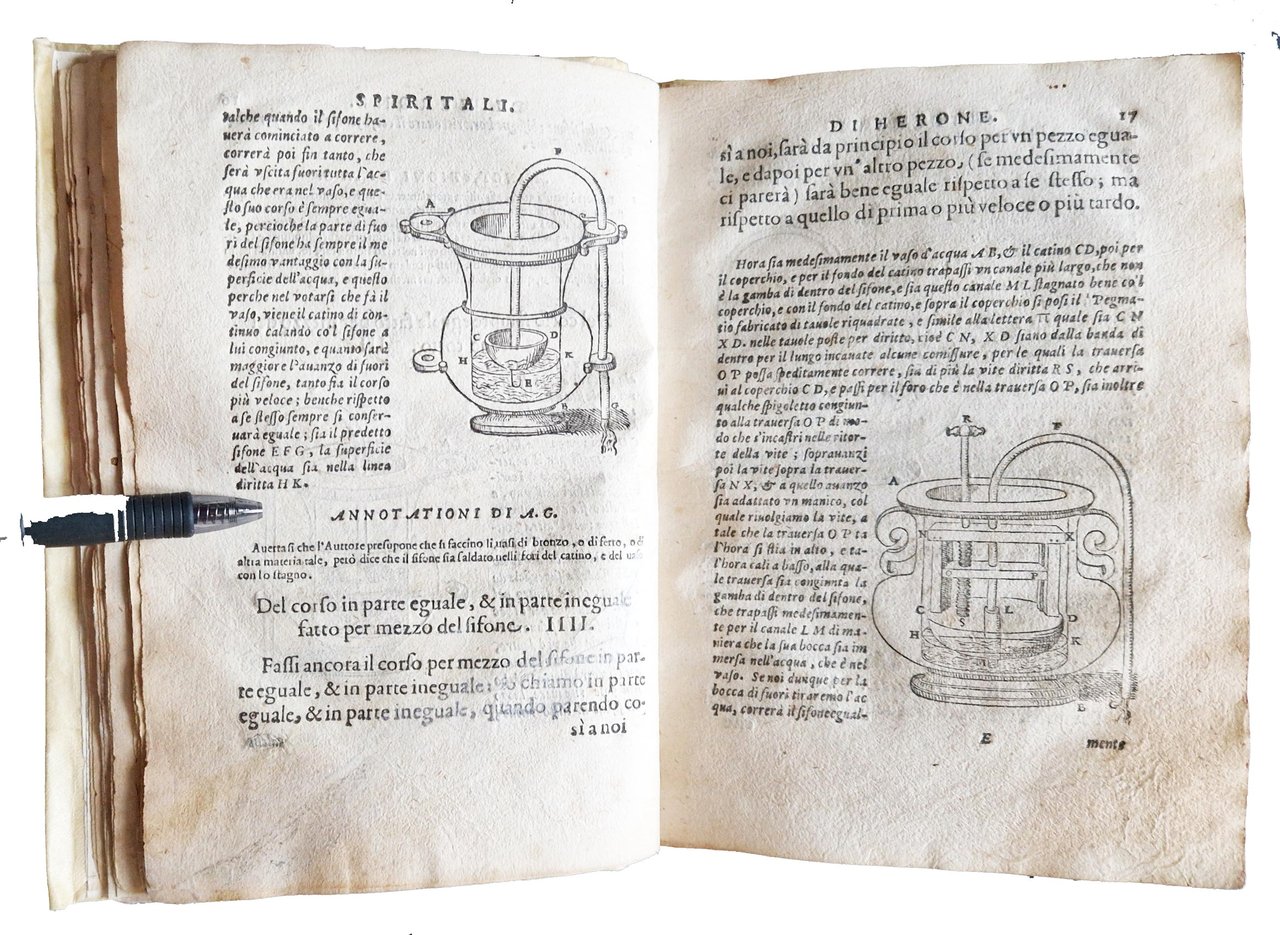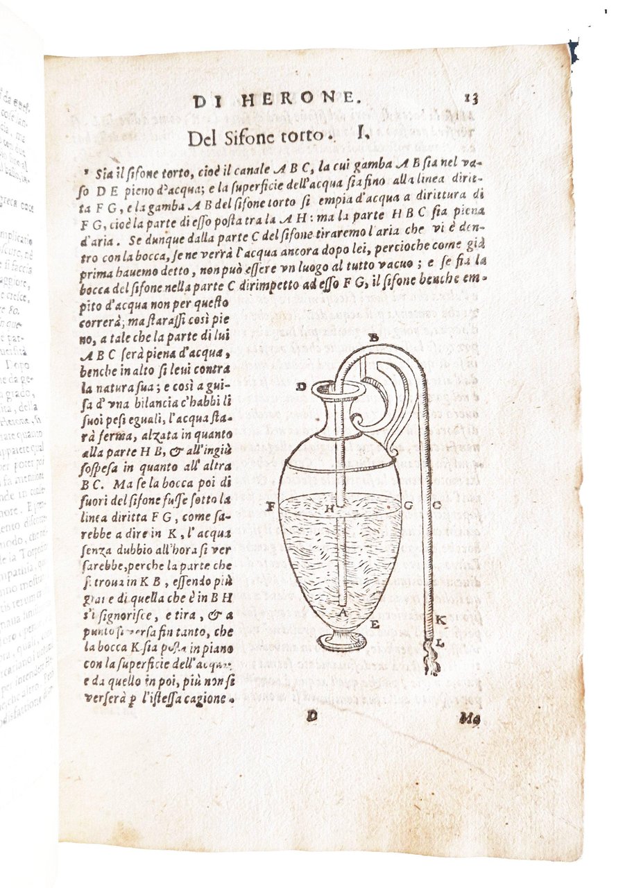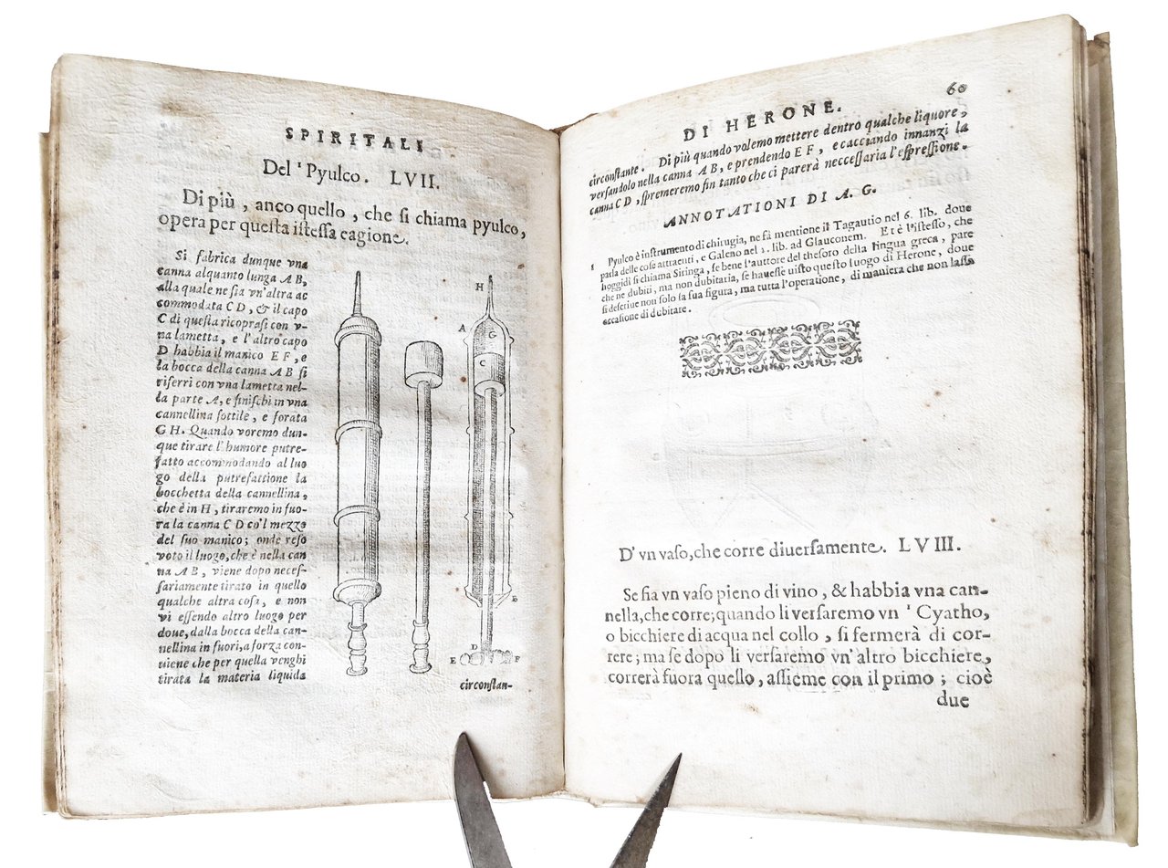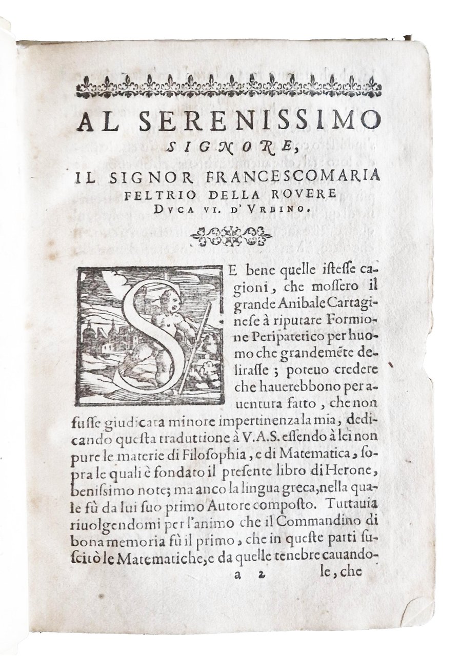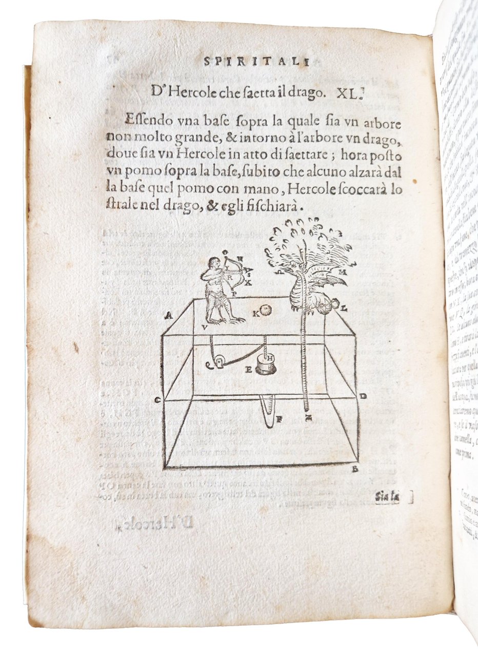 in-8°, 200x140 mm, leg. successiva in pergamena morbida; [4], 82 carte. Vignetta xilografica al frontespizio. Capilettera xilografici istoriati e fregi xilografici. Il testo è arricchito con numerosissime illustrazioni xilografiche di apparecchi e strumenti idraulici e meccanici. Prima edizione nella traduzione in Italiano di quest'opera già pubblicata in Latino a Urbino nel 1575 e poi a Parigi nel 1583, entrambe tradotte dall'opera originale in Greco del matematico Erone di Alessandria (vissuto nel II sec.). L'opera stimolò e contribuì in modo sostanziale all'interesse per la pneumatica, che emerse improvvisamente alla fine del XVI secolo e portò alle opere di Torricelli e Boyle. La "Pneumatica" non fu pubblicata in greco fino al 1693. È una delle principali fonti per la nostra conoscenza delle tecniche e della meccanica dell'antichità, e le numerose invenzioni idrauliche e meccaniche di Erone sono qui illustrate per la prima volta a stampa. L'opera comprende studi di pneumatica e meccanica e include 89 illustrazioni di diverse invenzioni, come sifoni, fontane, motori, una descrizione di una piccola macchina a vapore stazionaria (che è della forma ora nota come brevetto di Avery, la pompa a doppia forza ecc., che "con l'unione di aria (compressa), terra, fuoco e acqua, e il concorso di principi elementari, soddisfa i bisogni più urgenti della vita umana, (o) produce stupore e allarme". Il libro descrive molti congegni e trucchi magici e include il primo suggerimento di una macchina a vapore. Rif.: IT\ICCU\BVEE\004099. CNCE 22646. OCLC, 797306807. Cond.: Legatura non coeva ma in ottime condizioni. Carte abbastanza pulite, ma con alcune fioriture e occasionali bruniture. Piccolissima mancanza al margine esterno delle prime 9 carte. Presenza di un taglio all'angolo inferiore esterno con perdita di carta, ma senza penalizzazioni del testo, alla decima ed undicesima carta. Antiche macchie brune lungo quasi tutto il taglio esterno delle carte. Esemplare nel complesso decisamente buono.