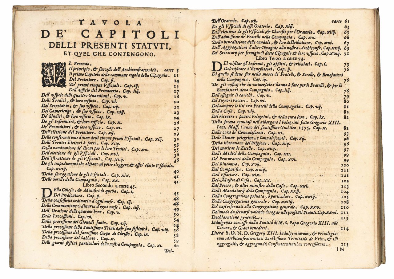 4to (238x164 mm). [8], 120 pp. Collation: +4 A-P4. Woodcut emblem of the Archconfraternity on the title page. Contemporary limp vellum, inked title on spine. Giuseppe Arconati Visconti red stamp on the title page. Light foxing and browning, but a very good, genuine copy.