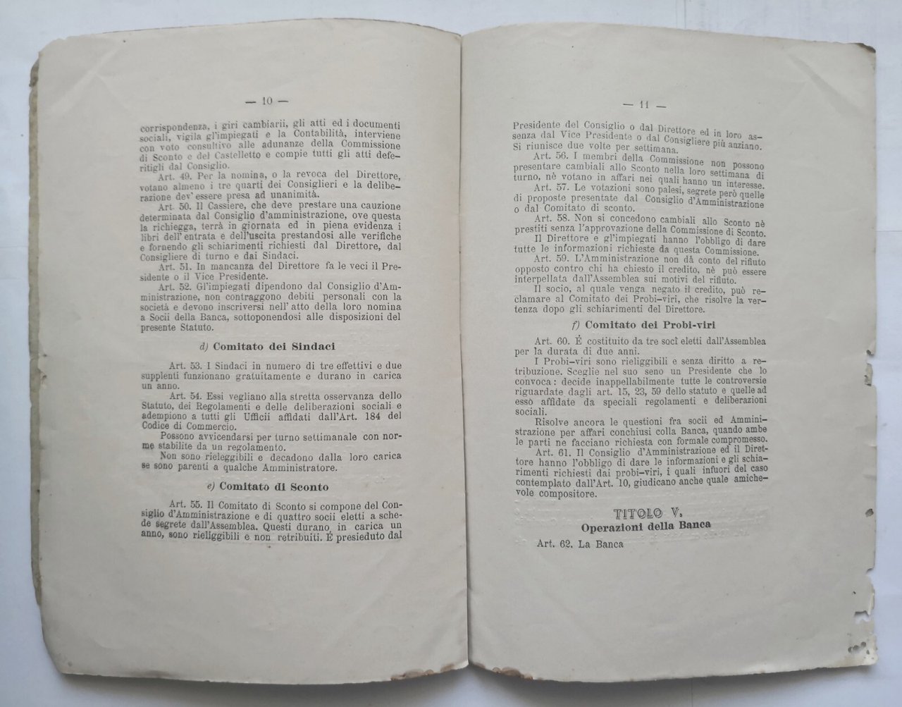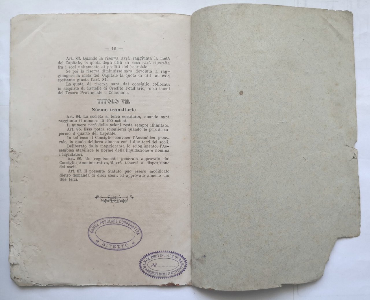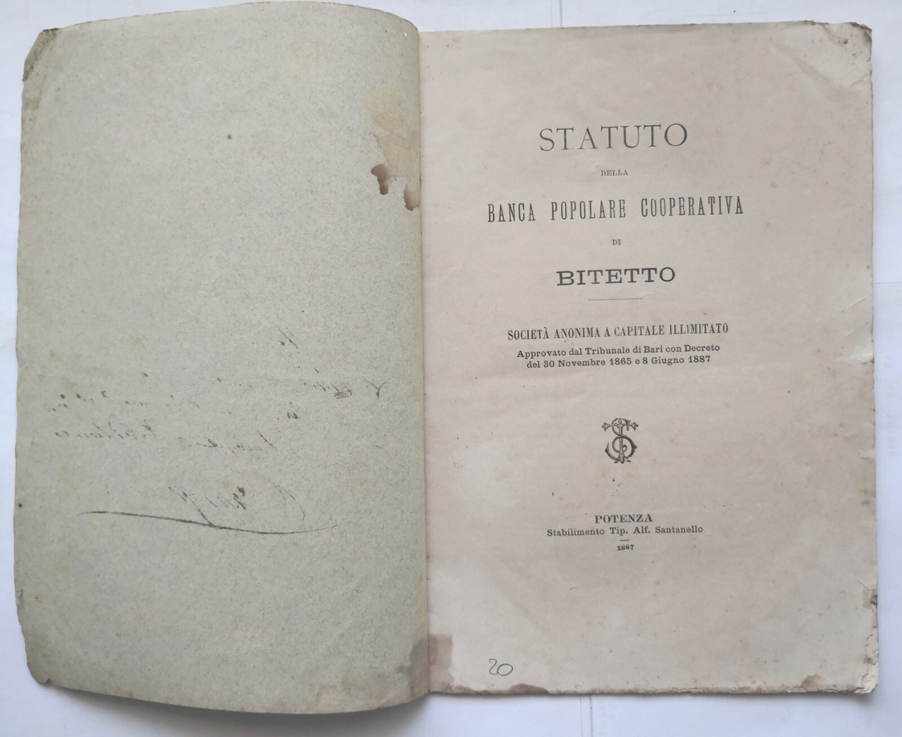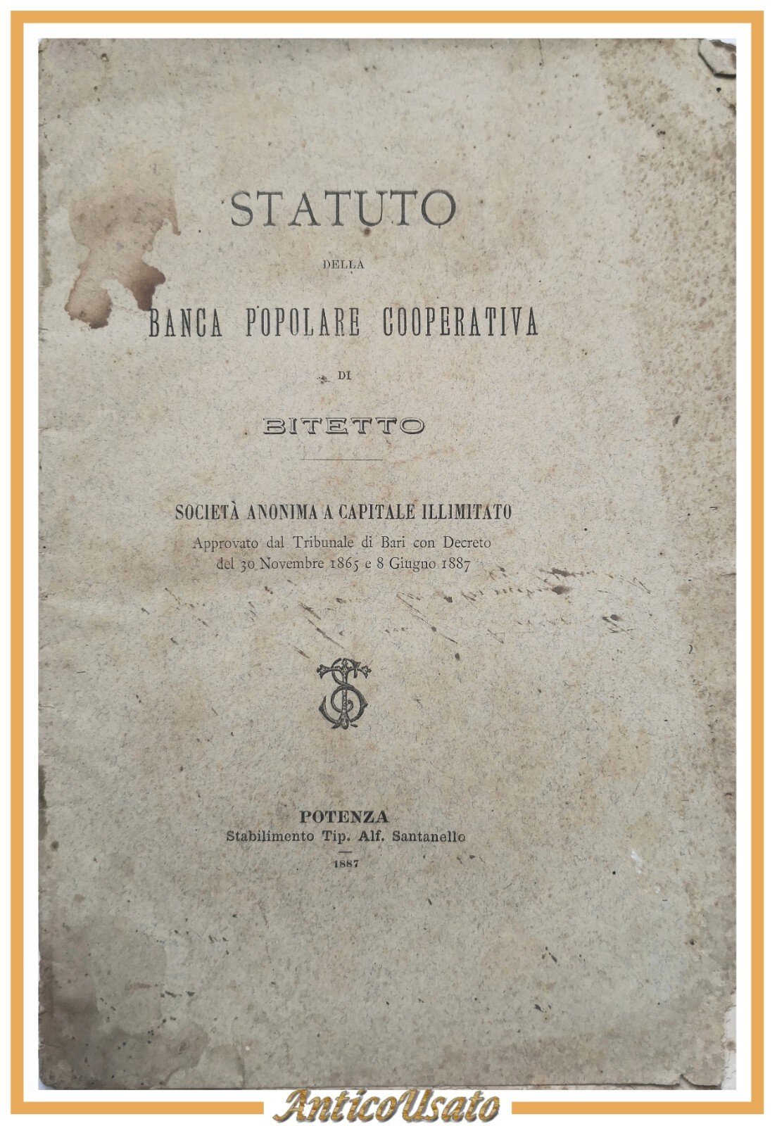 STATUTO DELLA BANCA POPOLARE COOPERATIVA DI BITETTO 1887 Santanello Libro antico