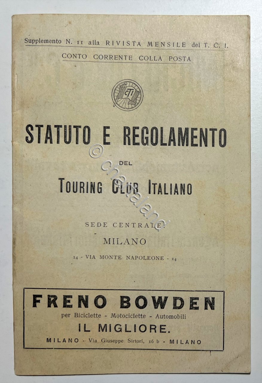 Suppl. N. 11 alla Rivista - Statuto e Regolamento del Touring Club Italiano 1904 Testo in lingua italiana. Pagine 28 con alcune illustrazioni. Copertina morbida. Condizioni molto buone.