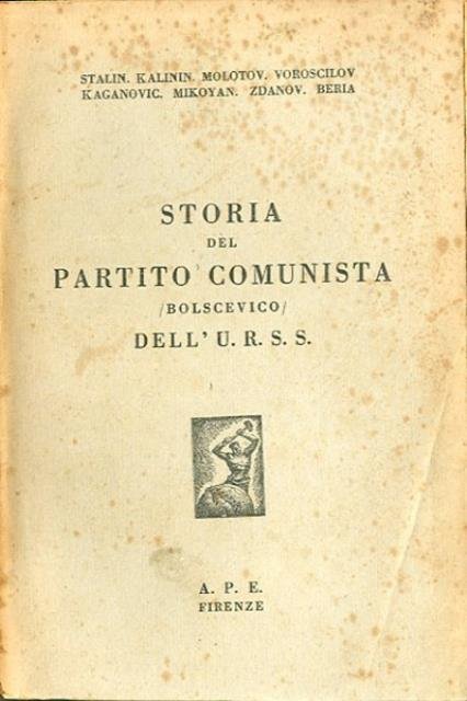 VIII, 448 p. ; 20 x 14 cm. Questa «Storia del Partito comunista (bolscevico) dell’URSS» venne redatta da una commissione del Comitato Centrale diretta da Stalin e pubblicata per la prima volta nel 1938. Il libro parte dalle origini del movimento socialista russi negli anni Ottanta del 19. secolo con l’esplosione delle lotte per l’abolizione della schiavitù della gleba, e, passando attraverso la fondazione del Partito operaio socialdemocratico e la formazione all'inizio del nuovo secolo delle frazioni bolscevica e menscevica. Il racconto, "ufficiale", culmina con l’esplosione della rivoluzione d'Ottobre (1917) e l'affermarsi poi del regime comunista e dello stalinismo. In testa al front.: Stalin, Kalinin, Molotov, Voroscilov, Kaganovic, Mikoyan, Zdanov, Beria. Questa edizione non datata ma presumibilmente pubblicata tra gli ultimi mesi del 1944 e i primi del 1945 a Firenze è una delle prime traduzioni integrali edite in Italia. Brossura editoriale, coperta in cartoncino flessibile, titolo impresso al piatto e al dorso. Segni del tempo alla coperta, ai risvolti, al taglio e alle pagine interne (ingiallimento della carta e fioriture), per il resto libro integro. Codice libreria 6814.