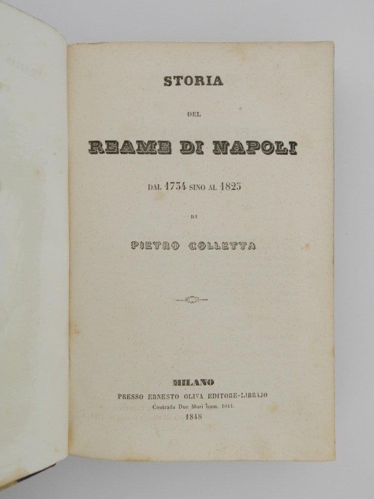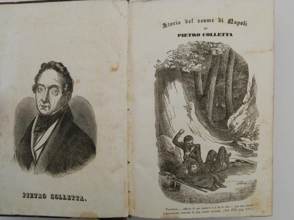 210x140 mm, pp. 708; frontespizio inciso, ritratto di Colletta all'antiporta, elegante legatura coeva in mezza pelle, titolo in oro al dorso che è diviso da 4 nervi, piatti marmorizzati, tagli colorati, qualche brunitura alle copertine, per il resto molto buono. *** TUTTI I NOSTRI LIBRI SONO VISIBILI PREVIO CONTATTO MAIL O TELEFONO NELLA NUOVA SEDE DI MILANO: LIBRERIA COSMOPOLIS, VIA JOMMELLI, 22. ***