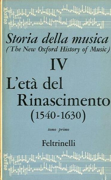 2. v. (XII, 1054 p., [32] p. di tav.; ) : ill ; 25 x 15 cm. Questo quarto e doppio volume della oxfordiana "Storia della musica" descrive le vicende della completa penetrazione della cultura musicale umanista nel pensiero e nella sensibilità europei attraverso un lungo e lento processo che portarono a completa maturazione questa "ars nova". Titolo originale dell'opera: «New Oxford history of music. 4. The age of Humanism: (1540-1630)». Traduzione di Francesco Bussi. Legatura editoriale, coperta in cartone rigido telato di colore rosso scuro, con impresso il titolo in oro al dorso, muto il piatto. Sovraccoperta in carta colorata plastificata lucida. Qualche segno del tempo alla sovraccoperta (ingiallimento del dorso) e piccole lacerazione ai profili, per il resto esemplare integro. All'interno tavole fuori testo illustrate su carta patinata lucida in b/n (12) e a colori (20). Codice libreria 6672.