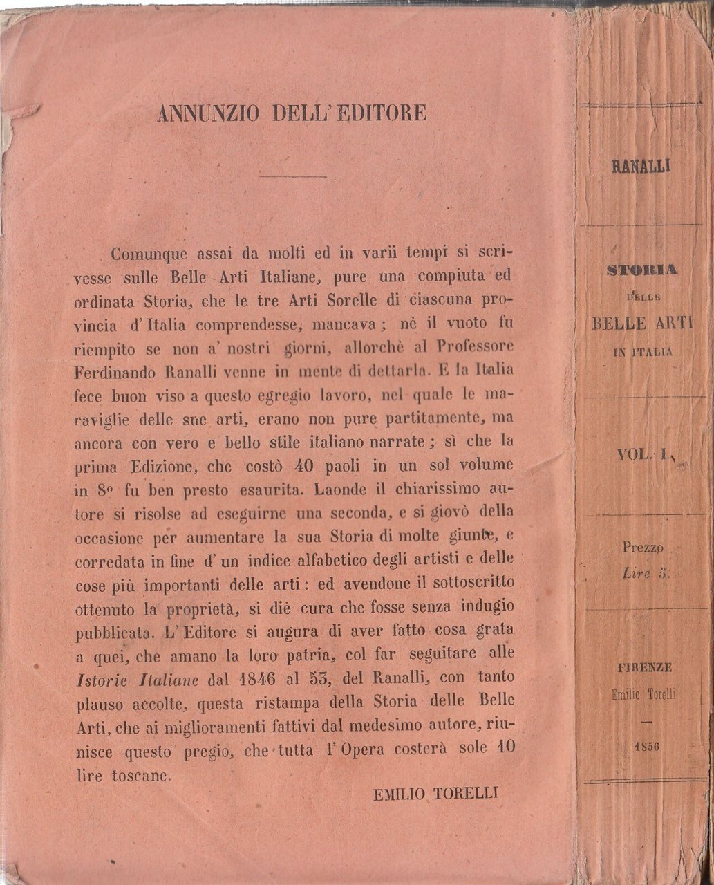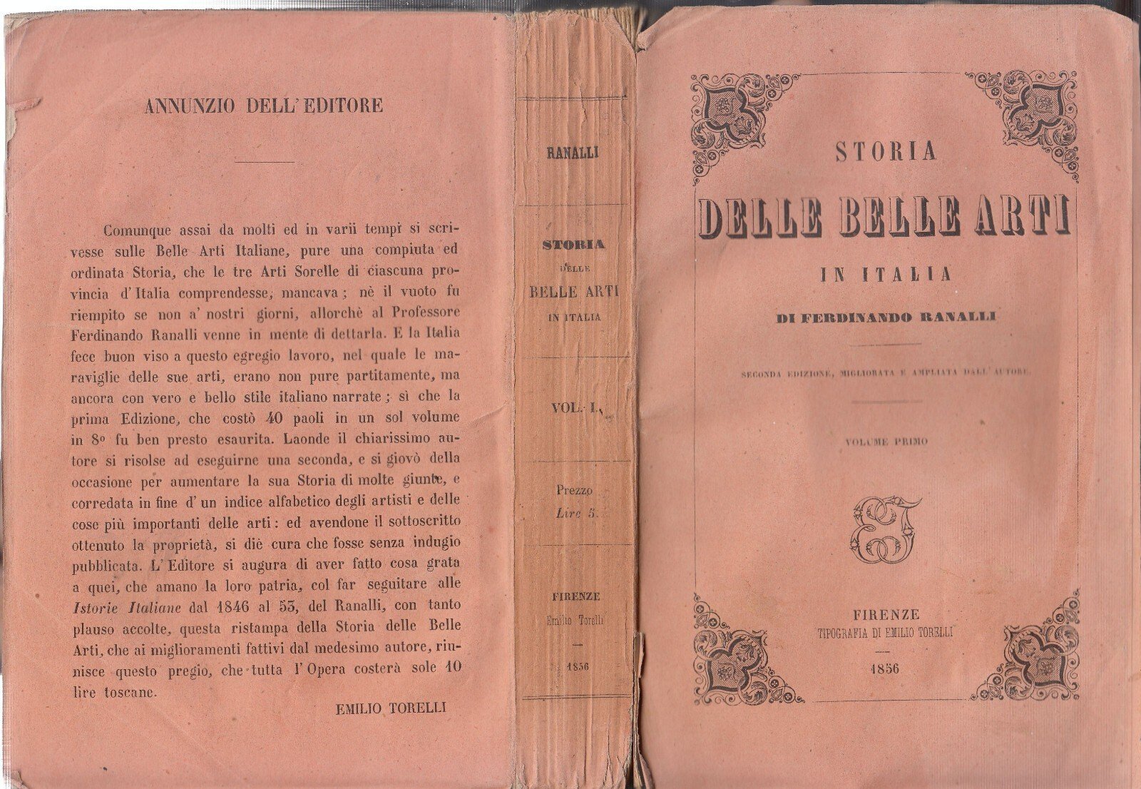 STORIA DELLE BELLE ARTI IN ITALIA Volume 1 di Ferdinando Ranalli 1856 Libro