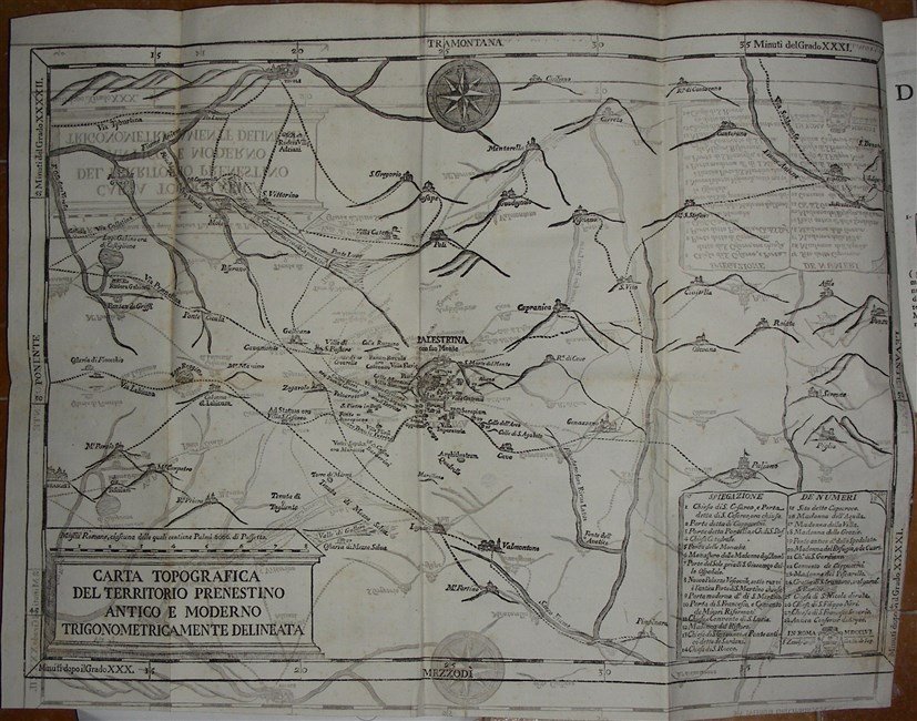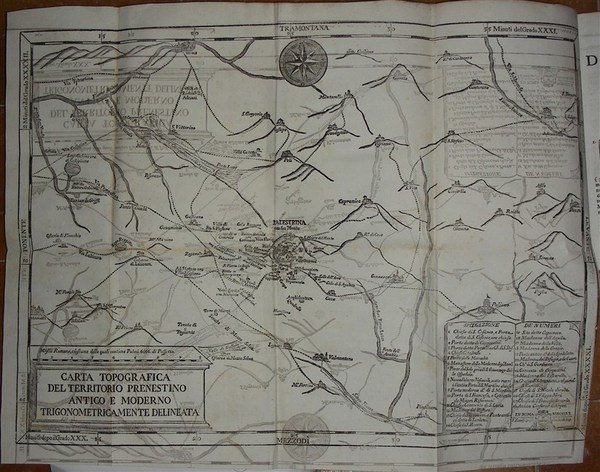 gr. vol. in-4, pp. XVI, (4), 431, bella leg. p. perg. coeva con tit. oro al d. Tagli spruzzati. Con una gr. carta topogr. inc. in rame raff. il territorio prenestino incentrata su Palestrina, e altre 3 gr. carte in rame ripiegate al fine raff. monumenti antichi. Lozzi 3331: "Non comune". Belliss. esempl. [524]