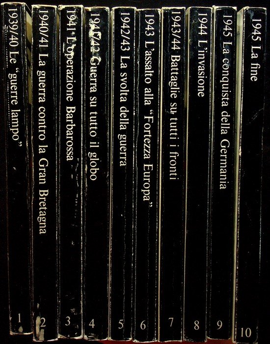 10 volumi di ca. 200 p. cad., 18 cm, bross. Condizioni : USATO - Stato : Buono, ordinari segni d'uso e del tempo. Altre note : IL PREZZO SI RIFERISCE AI 10 VOLUMI INSIEME (opera completa). 2000 pagine, 2500 illustrazioni, documenti originali, schemi, carte da tutti i campi di battaglia di Europa, Africa e Asia; i titoli dei singoli volumi: le "guerre lampo", la guerra contro la Gran Bretagna, l'operazione Barbarossa, guerra su tutto il globo, la svolta della guerra, l'assalto alla "Fortezza Europa", battaglie su tutti i fronti, l'invasione, la conquista della Germania, la fine.