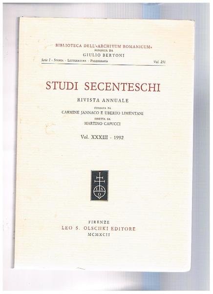 Studi secenteschi, rivista annuale della biblioreca dell"Archivium Romanicum" findata da Giulio Bertoni serie I° storia, letteratura, paleografia. Vol. XXXIII 1992.