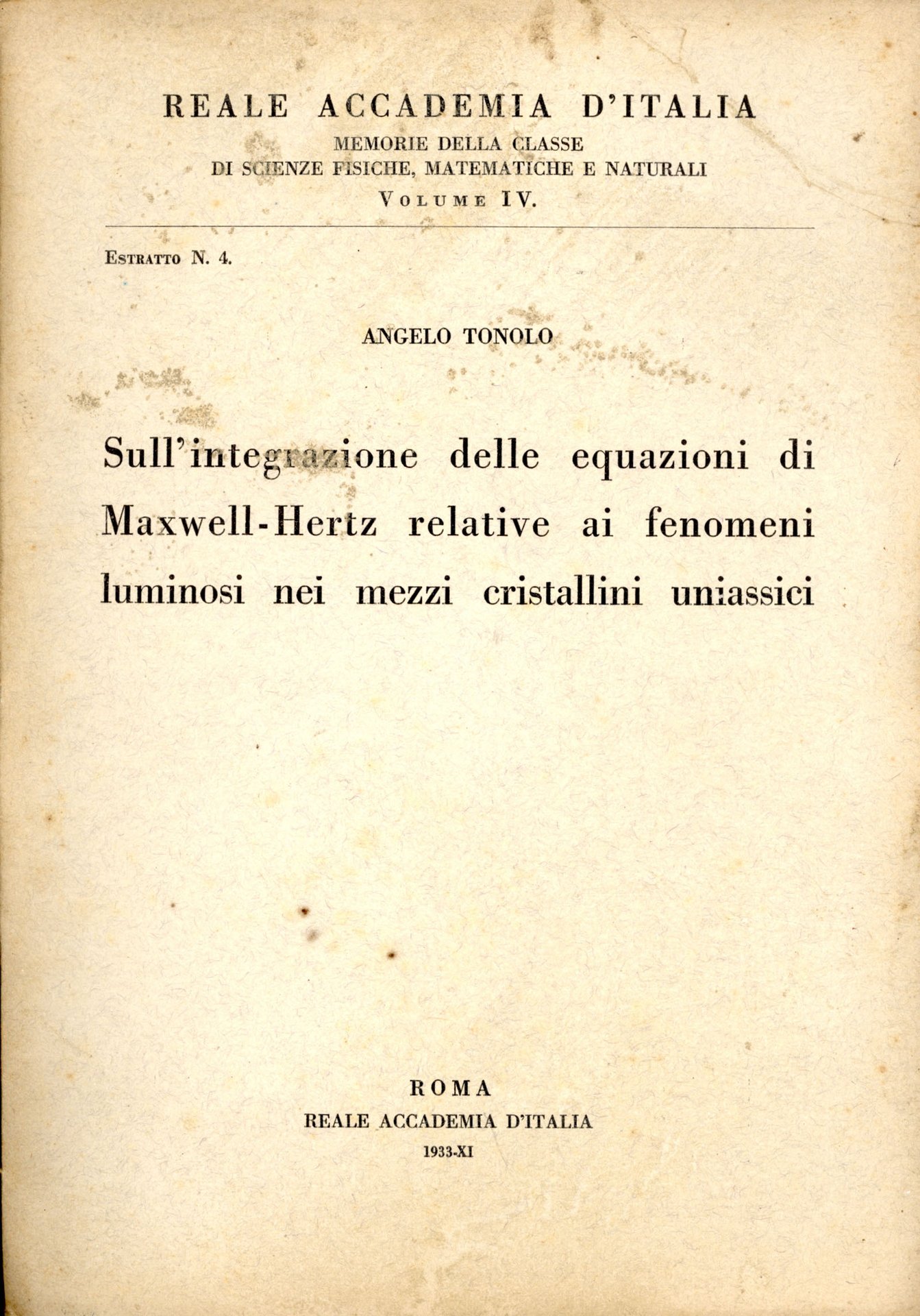 Sull'integrazione delle equazioni di Maxwell-Hertz relative a fenomeni luminosi nei mezzi cristallini uniassici. Estratto dalle Memorie della Classe di di Scienze fisiche matematiche e naturali, vol. IV. Realte Accademia d'Italia. 530 � BA In Quarti ( 24-30cm ) Buono (Good) Buono