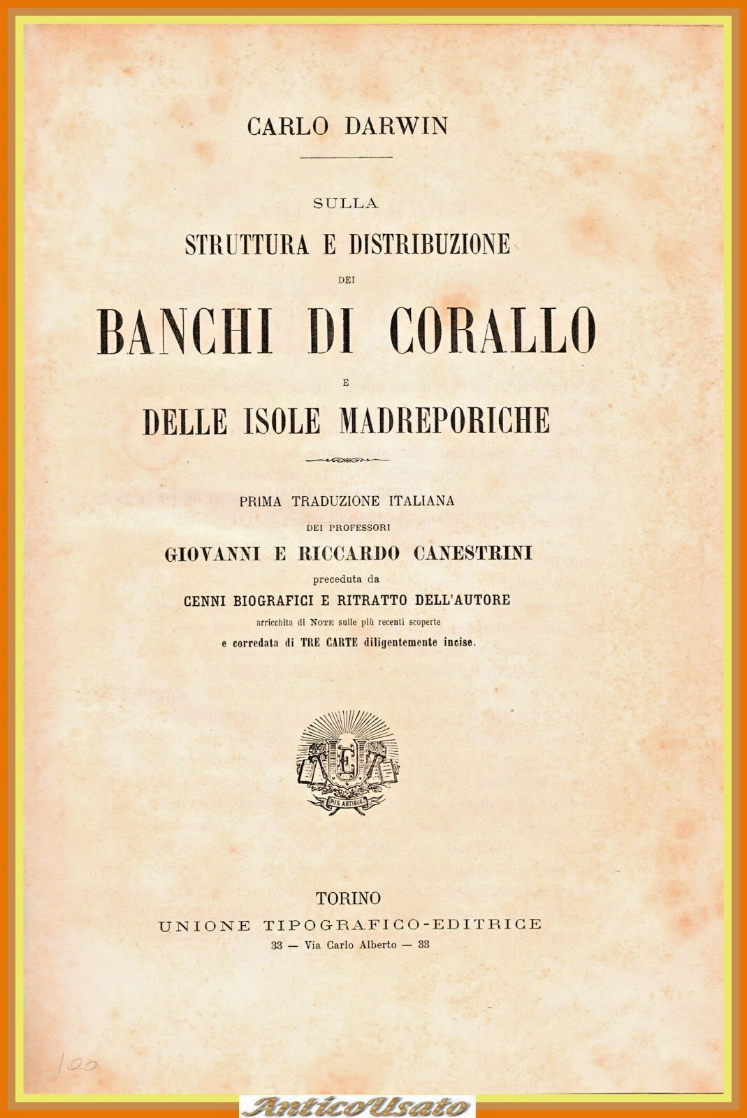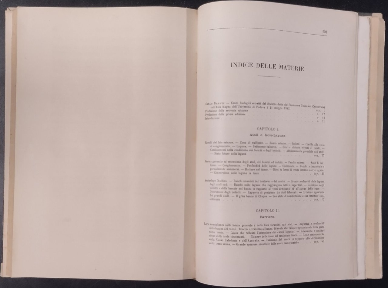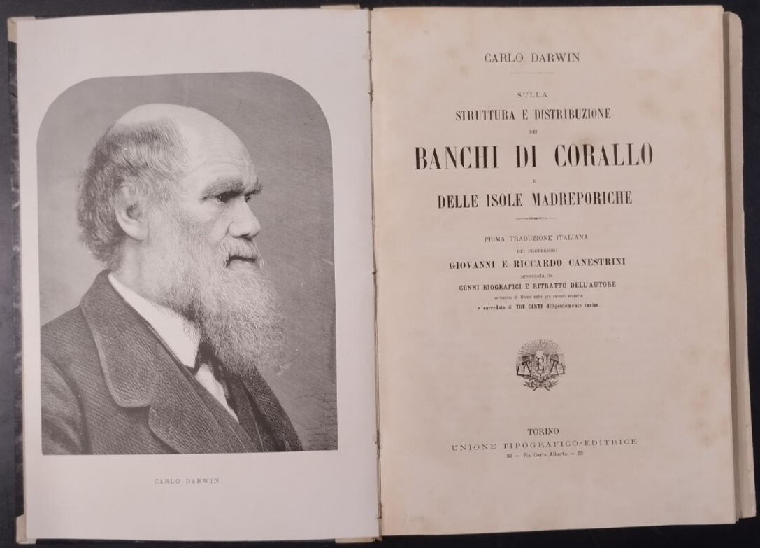 SULLA STRUTTURA E DISTRIBUZIONE DEI BANCHI DI CORALLO e delle isole Madreporiche di Carlo Darwin. Prima traduzione italiana di Giovanni e Riccardo canestrini preceduta da accenni biografici e ritratto dell'autore arricchita di note sulla più recenti scoperte e corredato di tre carte diligentemente incise.Torino Unione tipografico Editrice, Prima edizione ,1888 . 210 pagine, 3 tavole Ripiegate incise di cui 2 a colori fuori testo, fotografia in bianco e nero dell'autore in antiporta. Copertina Coeva in mezza pergamena. Dimensioni: 18 5 x 26 cm . Stato di conservazione: molto buono (pagine normalmente ingiallite) Libro antico natura biologia evoluzionismo