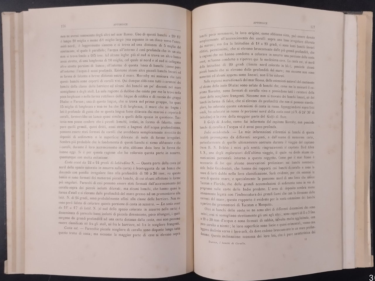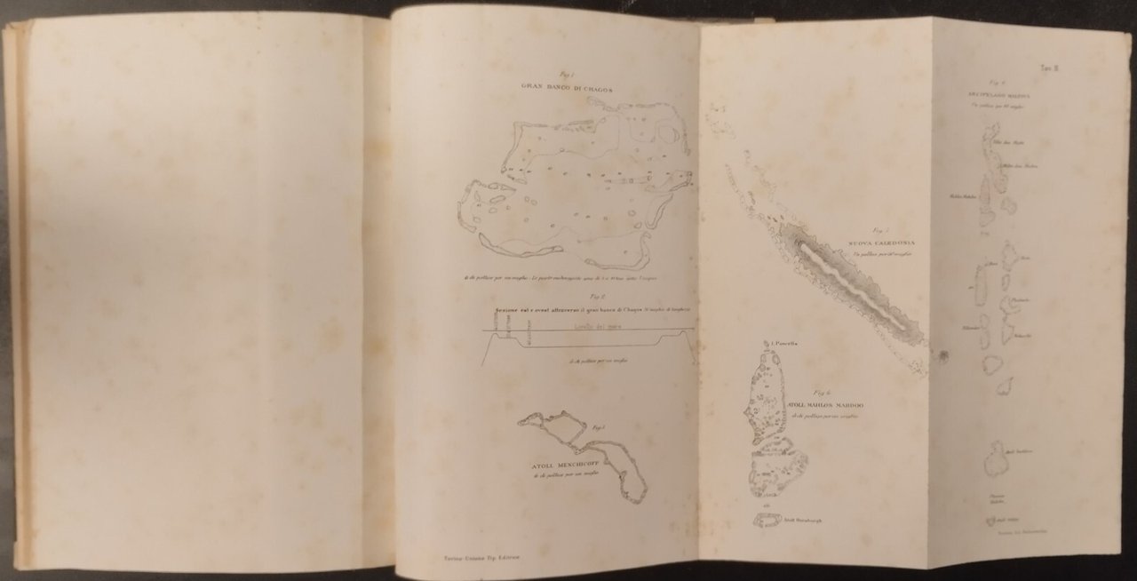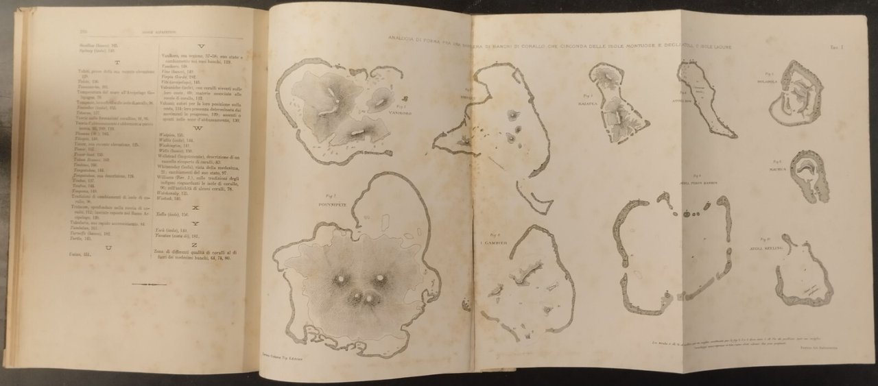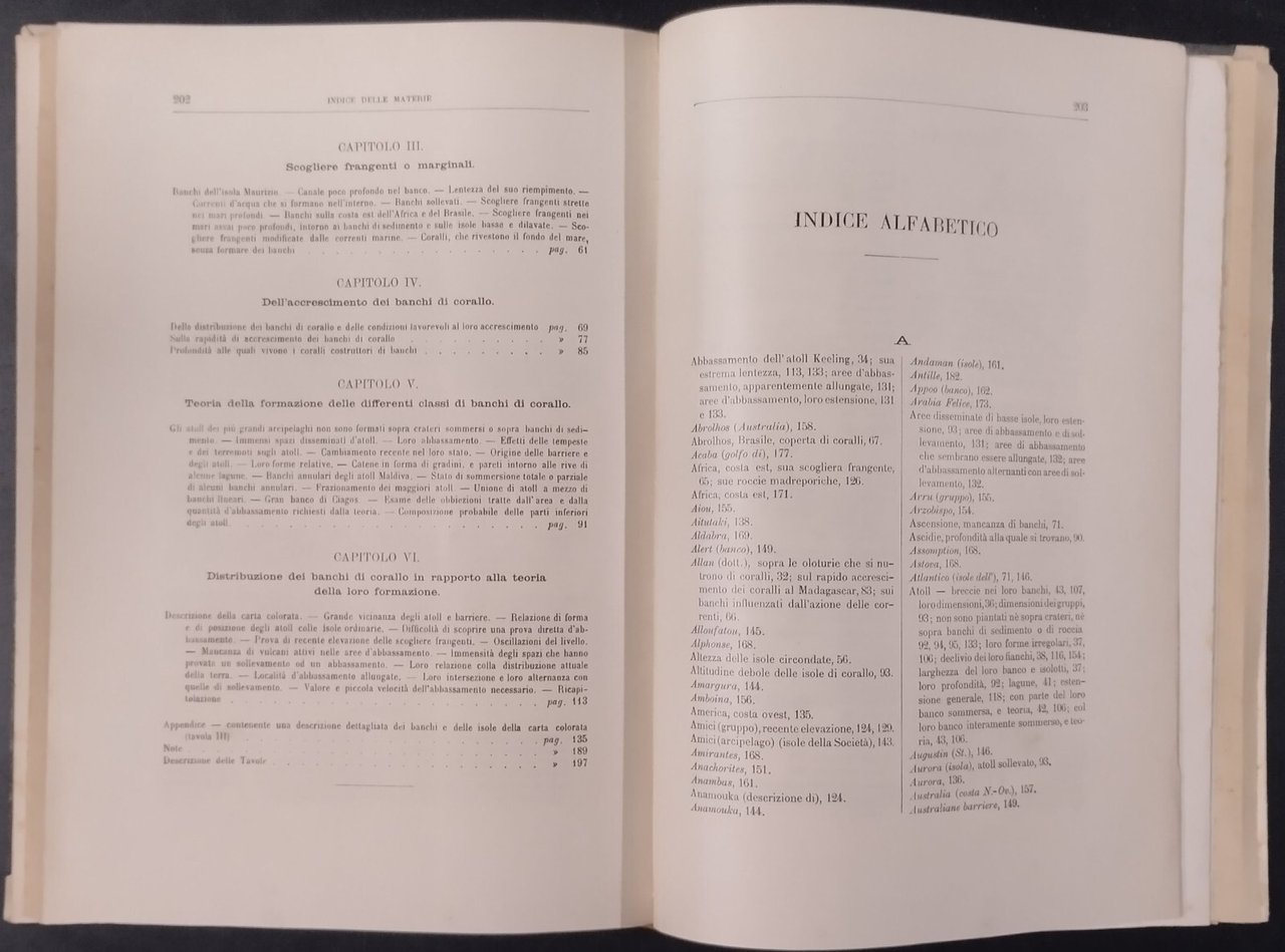 SULLA STRUTTURA E DISTRIBUZIONE DEI BANCHI DI CORALLO e delle isole Madreporiche di Carlo Darwin. Prima traduzione italiana di Giovanni e Riccardo canestrini preceduta da accenni biografici e ritratto dell'autore arricchita di note sulla più recenti scoperte e corredato di tre carte diligentemente incise.Torino Unione tipografico Editrice, Prima edizione ,1888 . 210 pagine, 3 tavole Ripiegate incise di cui 2 a colori fuori testo, fotografia in bianco e nero dell'autore in antiporta. Copertina Coeva in mezza pergamena. Dimensioni: 18 5 x 26 cm . Stato di conservazione: molto buono (pagine normalmente ingiallite) Libro antico natura biologia evoluzionismo