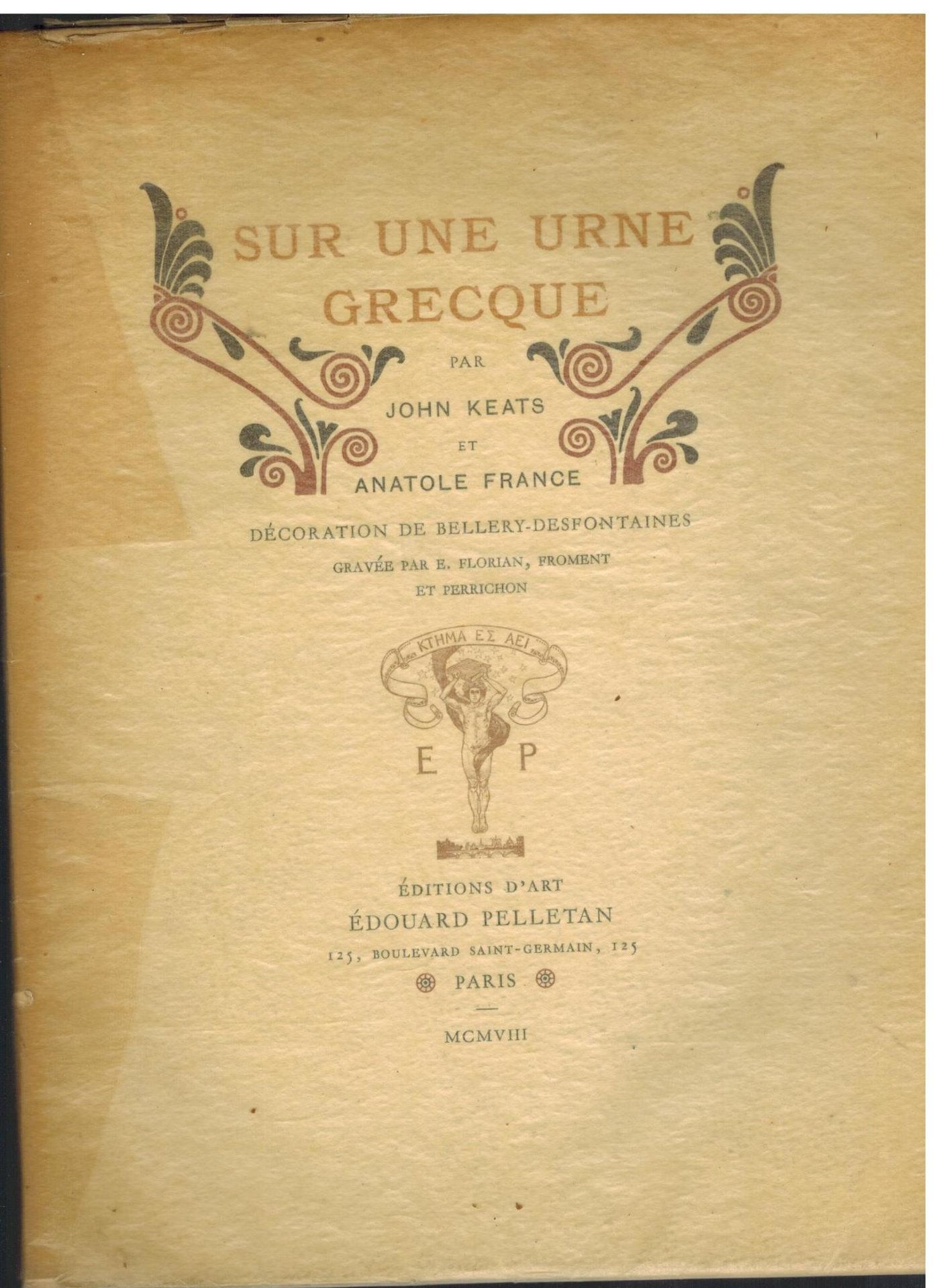 Par John Keats et Anatole France. Décoration de Bellery-Desfontaines gravée par E. Floria, Froment et Perrichon". In -4°, pp. 30, brossura editoriale con sovracoperta e frontespizio al piatto superiore. Esemplare numerato, n. 164 su un totale di 235, stampato su "velin du Marais". Edizione bilingue del testo di Keats, stampata in occasione dell'esposizione franco-britannica di Londra, con illustrazioni in nero e rosso di Bellery-Desfontaines, incise da Florian, Froment e Ferrichon.