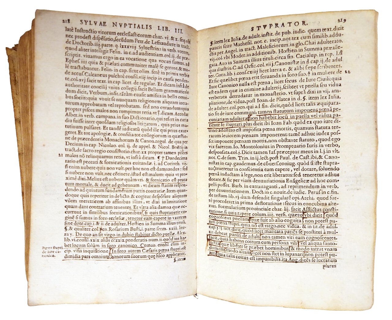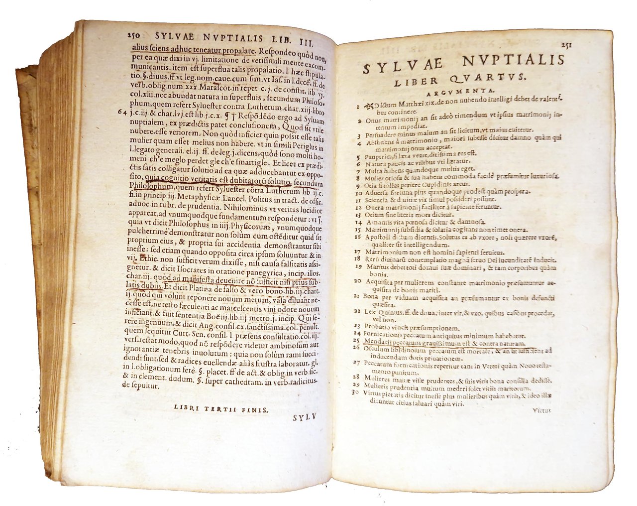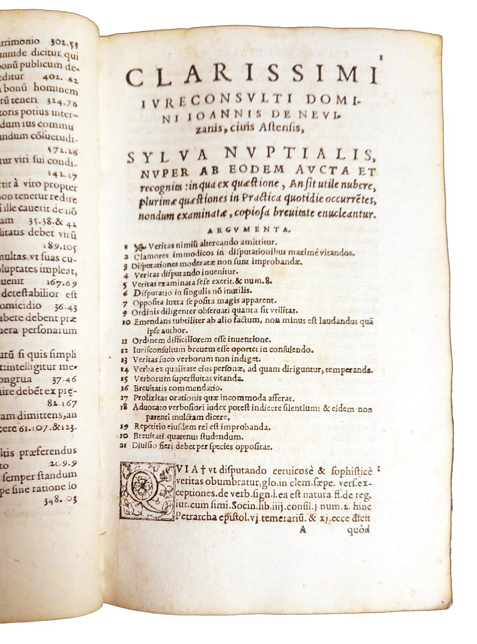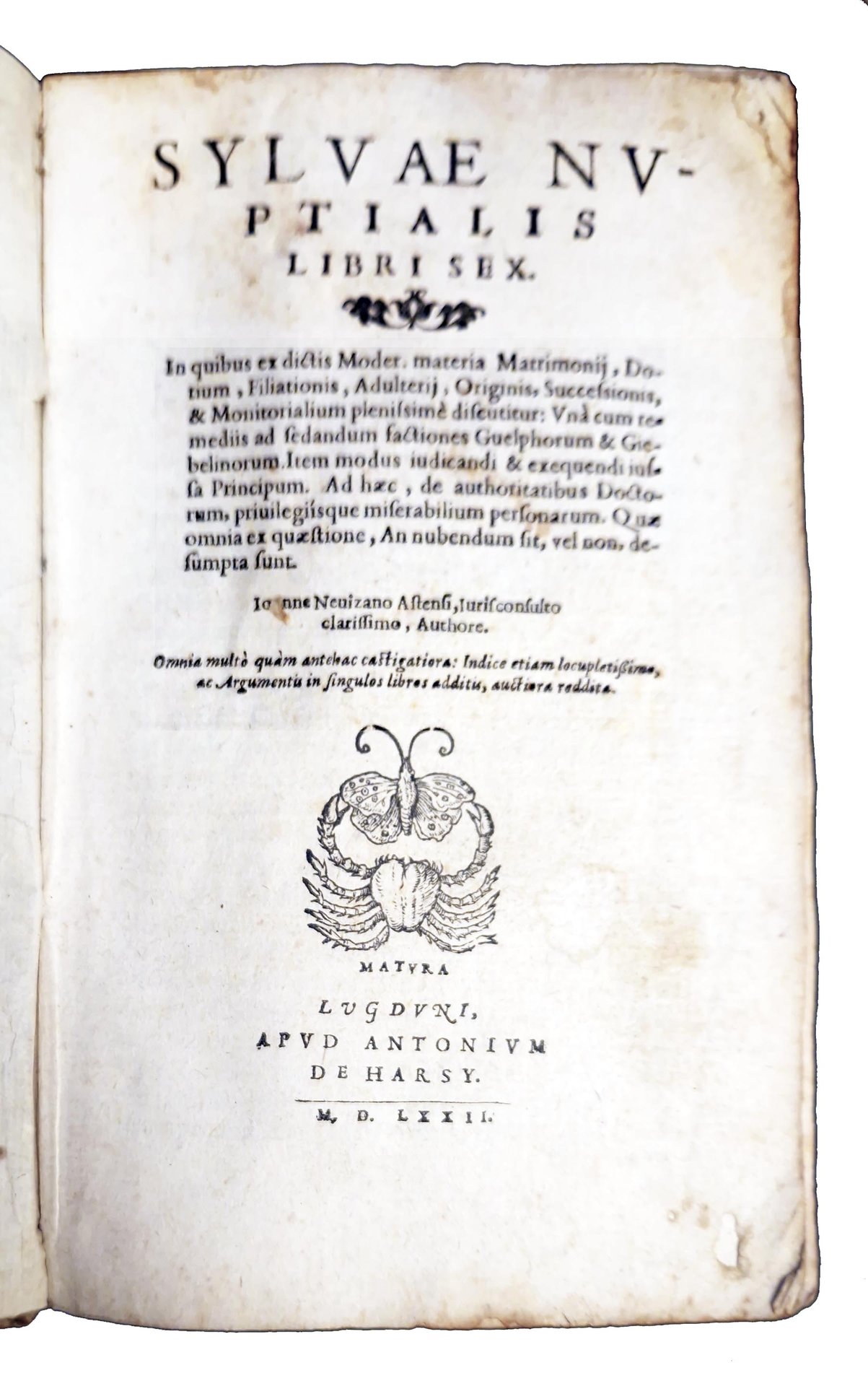 in-8°, 172x108 mm, leg. coeva in pergamena, titolo manoscritto al dorso e al taglio inferiore; pp. [32], 601, [6], [1 b.]. Marca xil. sul frontespizio (granchio trattiene una farfalla con le chele; motto: Matura). Vignetta xil. al colophon. Interessante trattato sul matrimonio (la prima edizione, pubblicata postuma a Lione nel 1545, era una revisione dell'opera Sylva nuptialis originariamente pubblicata nel 1521, ora pressocchè irreperibile) suddiviso in sei libri, nei quali l'Autore, il giureconsulto italiano Giovanni Nevizzano (morto nel 1540) tratta del matrimonio, della dote, della filiazione, dell'adulterio e della successione, in particolare degli aspetti legali del matrimonio alla luce di tematiche sociali e culturali (ordini dei Principi, posizioni delle fazioni Guelfe e Ghibelline), al fine di risolvere la questione se sia opportuno sposarsi o no. Per i toni caustici usati dall'Autore contro le donne e l'istituzione matrimoniale, a favore del concubinaggio e del libero amore, quest'opera suscitò molte polemiche a suo tempo e fu condannata all'Indice. Rif.: IT\ICCU\TO0E\003932. OCLC, 23641120. Cond.: Segni d'uso alla legatura (macchie, abrasioni, piccole mancanze, spaccatura lungo una cerniera, sbiaditura del titolo). Occasionali macchie a margine di alcune carte. Presenza di un alone d'umido al centro del libro, in corrispondenza delle ultime carte. Antiche sottolineature del testo. Esemplare in condizioni generali decisamente buone.