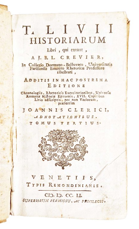 T. Livii Historiarum libri, qui extant […], Additis in hac postrema editione chronologiis rhetoricis exercitationibus […], XVII capitibus Livio adscriptis nec non variorum, praesertim Joannis Clerici, adnotationibus. Tomus tertius.