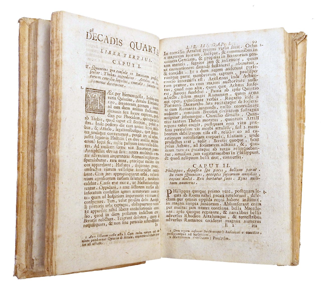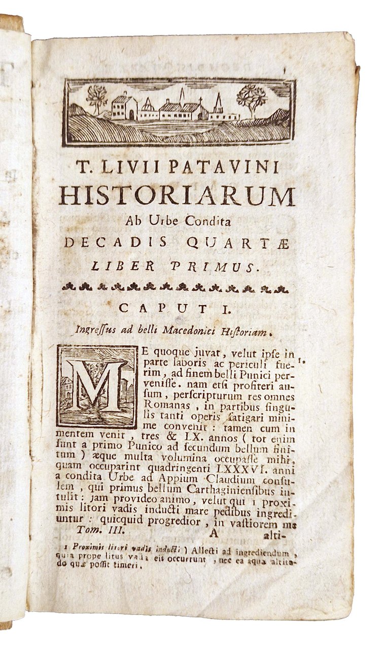in-12°, 152x88 mm, leg. coeva rigida in pergamena, titolo manoscritto al dorso, presenza di una fascetta di carta incollata al dorso con catalogazione di biblioteca privata; pp. (2), 576. Vignetta xilografica al frontespizio. Testatina, finalini e capilettera xilografici istoriati. Solo terzo tomo (di cinque) della famosa opera storica di Tito Livio, in questa edizione remondiniana. Rif.: IT\ICCU\RAVE\038870. OCLC, 1353137919. Cond.: Tracce d'uso alla legatura (lievi abrasioni). Carte abbastanza pulite, con occasionali macchie, pieghe e piccoli strappi marginali. Opera incompleta, ma esemplare buono.