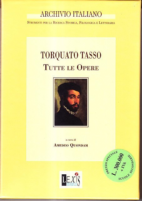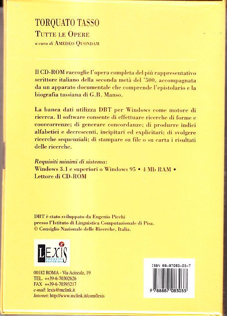 Tutte le opere. L'opera completa in CD-rom del più rappresentativo scrittore italiano della seconda metà del '500, accompagnata da un apparato documentale che comprende l'epistolario integrale e la biografia tassiana di G.B.Manso. A cura di A.Quondam. Roma, Lexis Progetti Editoriali, 1997, custodia di cm.15x21, Coll.Archivio Italiano, Strumenti per la Ricerca Storica, Filologica e Letteraria. Opera intonsa, sigillata da carta plastificata.