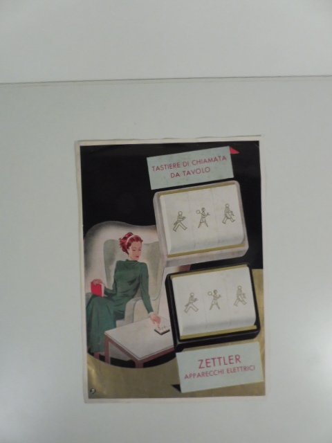 Foglio cm 15,8 x 22 con illustrazione al recto e dati tecnici al verso. No datato ma ascrivibile agli anni Trenta. Pubblicita' della tastiera di chiamata Zettler con tre tasti su ciascuno dei quali e' illustrata la persona che si desidera chiamare (donna di servizio, cameriere, calzolaio) da utilizzarsi negli alberghi.