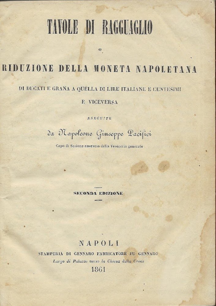 Tavole di ragguaglio o riduzione della moneta napoletana di ducati e grana a quella di lire italiane e centesimi e viceversa