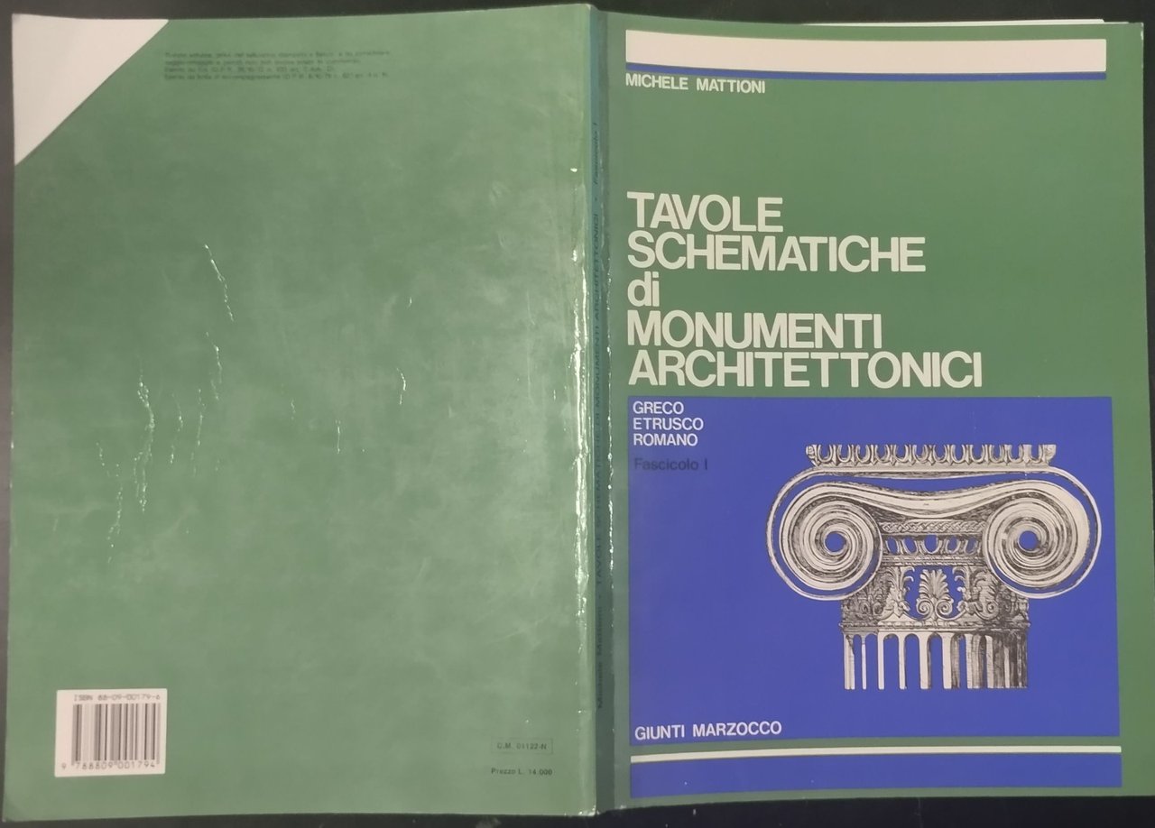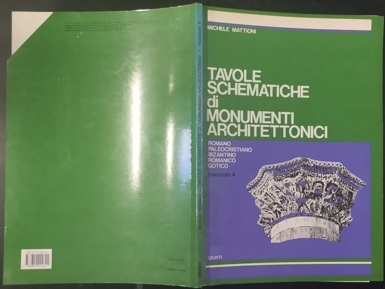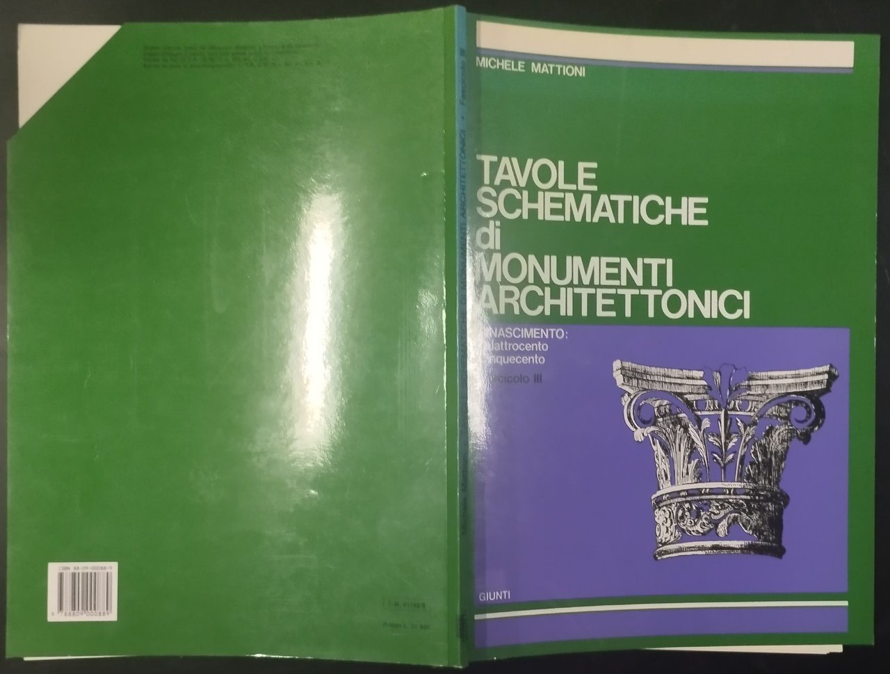 TAVOLE SCHEMATICHE DI MONUMENTI ARCHITETTONICI di Michele Mattioni (e Luca Quattrocchi). 4 volumi: 1) Greco Etrusco Romano, 2) Romano Paleocristiano Bizantino romanico gotico, 3) Rinascimento: Quattrocento e Cinquecento, 4) Barocco: Seicento e Settecento Neoclassico o Impero, Romantico, Architettura Contemporanea. Giunti Editore, 196130 + 50 + 39 + 50 pagine, XCII + CVI + LXXXV + CXII tavole, in bianco e nero fuori testo. Copertine editoriali in brossura. Stato di conservazione: molto buono (pagine normalmente ingiallite, mancano gli angolini superiori dei piatti posteriori) Libro usato saggistica