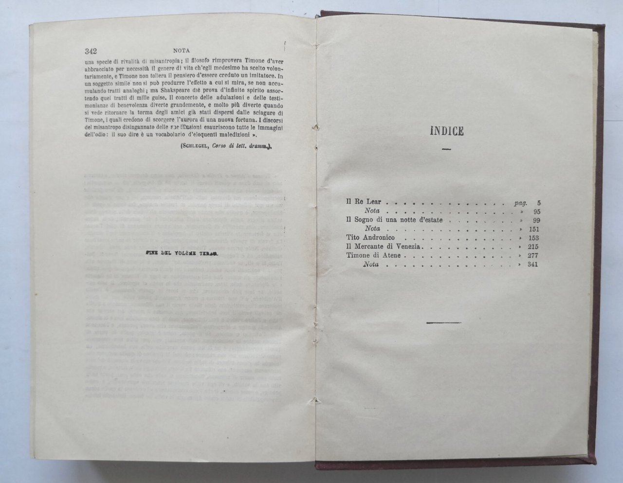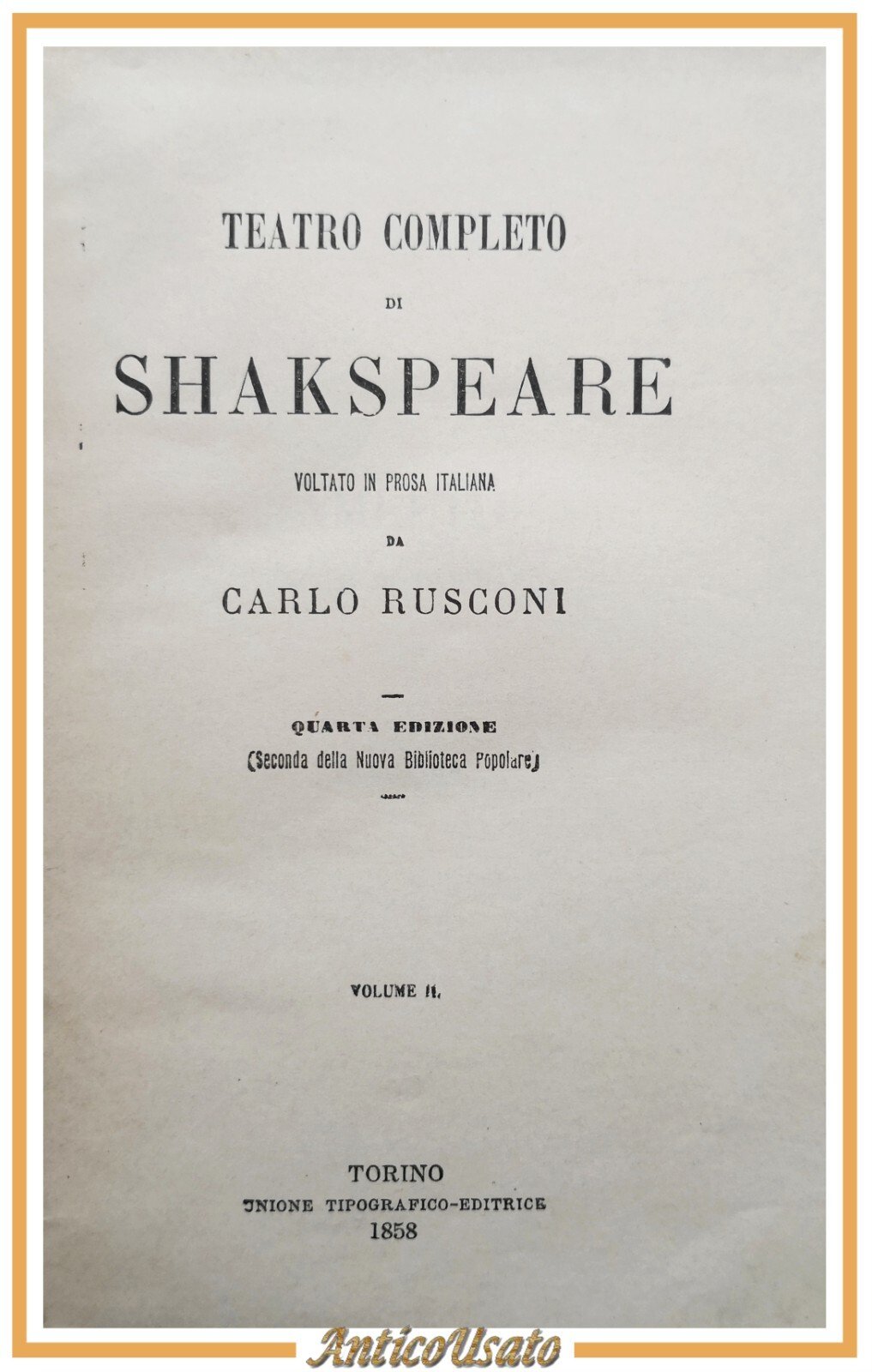 TEATRO COMPLETO DI SHAKESPEARE voltato in prosa italiana da Carlo Rusconi. Volumi II e III. Amleto, principe di Danimarca, Coriolano, Ciambelino, Antonio e Cleopatra, il Re Lear, Il sogno di una notte di mezza estate, Tito Andronico, Il mercante di Venezia, Timone di Atene.