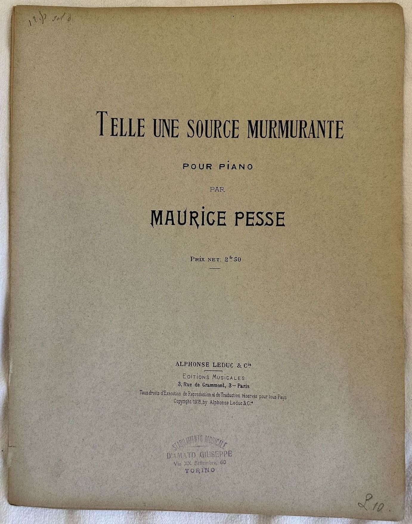 Edizione del 1916 della melodia "Telle une source murmurante" del compositore francese Maurice Pesse. In buone condizioni. Copertina editoriale in buone condizioni con lievi usure marginali. Piatti staccati. Legatura editorialmente assente. Pagine in buone condizioni con rare fioriture. In 4. cm.34,5x27. Pp. 7.Edition of 1916 of the melodiy "Telle une source murmurante" by the french composer Maurice Pesse. In good conditions. Editorial cover in good conditions lightly worn in the extremities. Plates are detached. Binding is editoriarly missing. Pages in good conditions with occasional foxing.In 4. cm.34,5x27. Pp. 7.