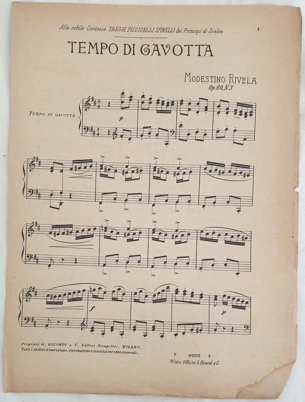 Partitura per pianoforte dei primi del novecento della melodia "Tempo di Gavotta" del compositore Modestino Rivela tratta dall'opera 20 n. 3. In buone condizioni con rare fioriture. Lievi usure marginali. Lieve gora all'angolo inferiore destro. Formato cm. 32,5x23,5. Pp. 4. Musical score for piano of early 20th century of the melody "Tempo di Gavotta" by the composer Modestino Rivela from the opera 20 n. 3. In good conditions with occasional foxings. Wearing in the edges. Light dump stain in the right foot corner. Formato cm. 32,5x23,5. Pp. 4.