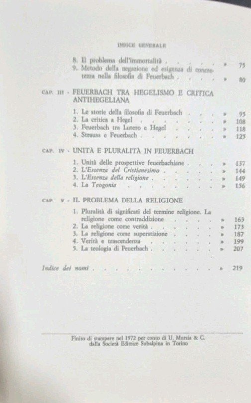 TEOLOGIA ED ESPERIENZA RELIGIOSA IN FEUERBACH di Ugo Perone 1972 Mursia Libro