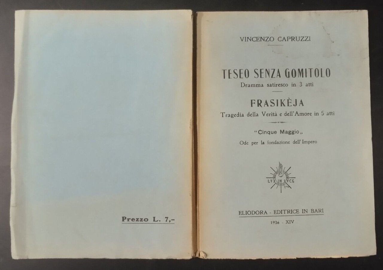 TESEO SENZA GOMITOLO Dramma satirico in tre atti, FRASIKÉJA Tragedia della Verità e dell'Amore in cinque atti di Vincenzo Capruzzi. Cinque maggio, ode per la fondazione dell'Impero.