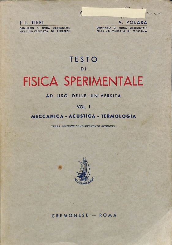 Testo di fisica sperimentale ad uso delle università. Vol.1. Meccanica - Acustica - Termologia | Livres anciens et modernes | Tieri L., Polara V.