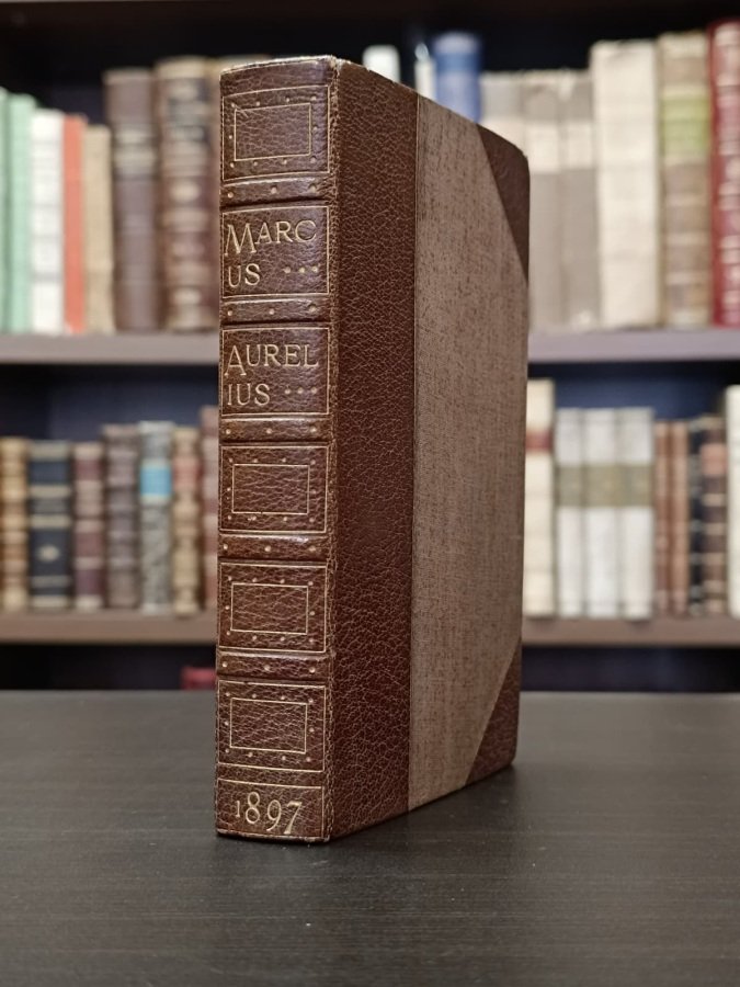 <span style="font-style: normal;">In-12° (cm. 15,8), gradevolissima legatura in mezza pelle ad angoli, dorso a finti nervi con titolo, fregi puntinati alle nervature e cornici di filetti sempre in oro ai comparti, taglio superiore dorato; pp. [8] 287 [1] su carta greve, in ottimo stato; fregio xilografico al frontespizio con titoli in rosso e nero, eleganti testatine e finalini sempre xilografici; lievi e sporadiche fioriture, grazioso </span><i>Ex Libris</i> illustrato applicato al contropiatto. Traduzione non comune delle celebri <i>Meditazioni</i> di Marco Aurelio. Esemplare molto buono. (NK7)
