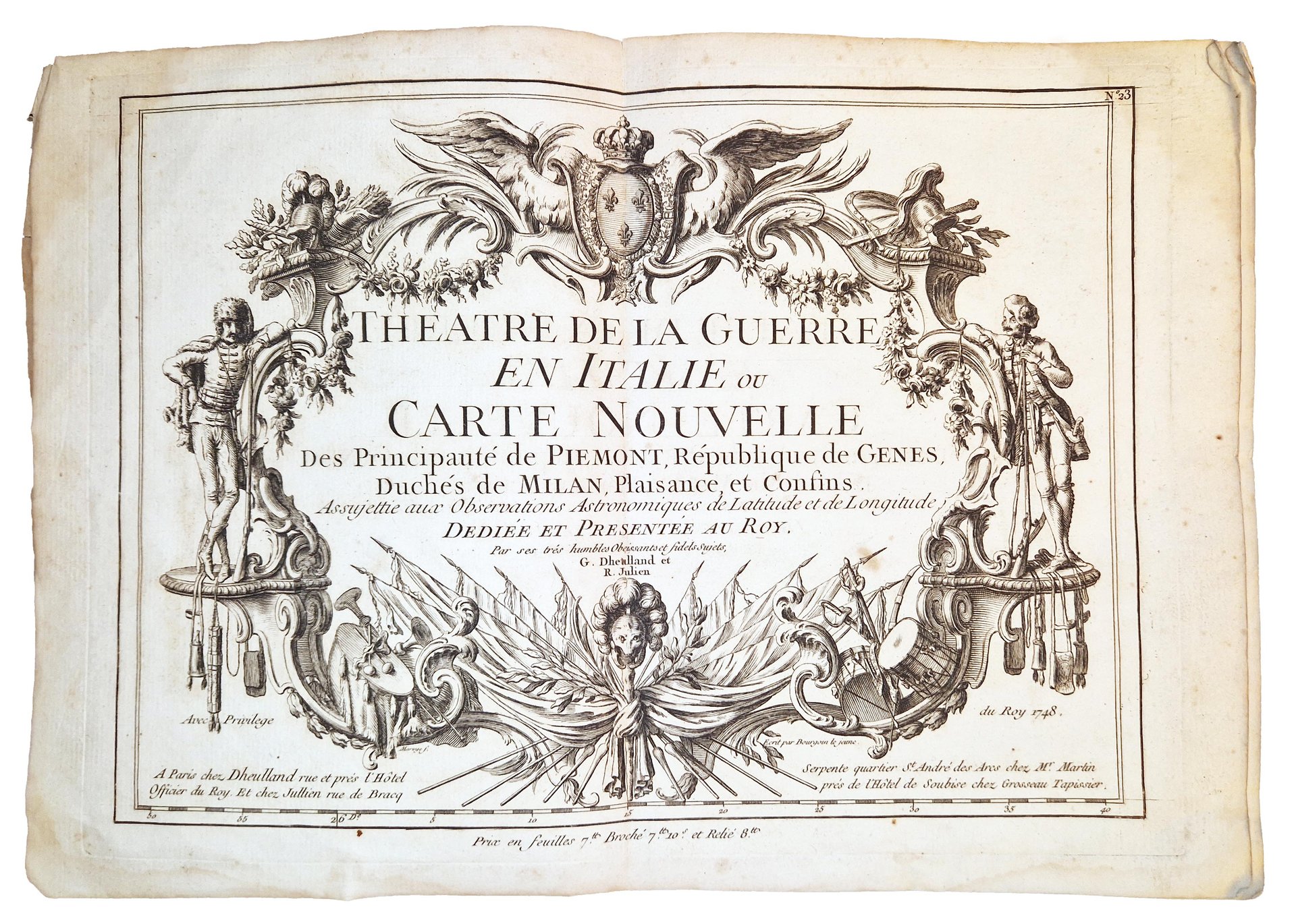 Theatre de la guerre en Italie ou Carte nouvelle des principaute de Piemonte, republique de Genes, duches de Milan, Plaisance et confins. Assujetties aux observations astronomiques de latitude et de longitude […] Par […] G. Dheulland et R. Julien.