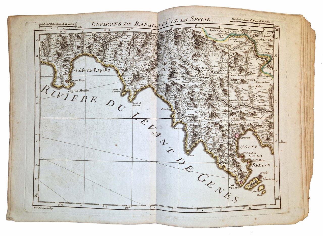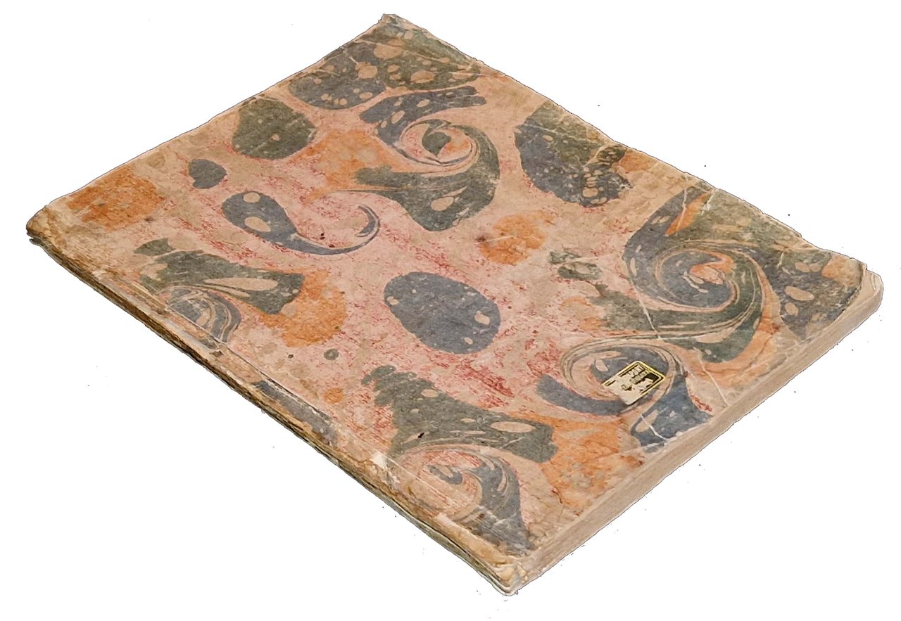 in-4°, 256x200 mm, leg. coeva in brossura con carta marmorizzata; [4] c., 24 c. di tav. doppie. Frontespizio alla c. di tav. 23. Le tavole sono tutte incise in rame, in b/n, con le frontiere e le città più importanti marcate a colori. Rara prima edizione di quest'opera storico-geografica, con belle tavole riccamente illustrate, raffiguranti il Piemonte, la Lombardia, la Liguria, la Sizzera, il Principato di Monaco e parte della Francia (Savoia e Costa Azzurra). Rif.: IT\ICCU\TO0E\049582. OCLC, 492526939. Leg.: Segni d'uso alla legatura (abrasioni e mancanze alle carte dei piatti). Presenza di leggere gore all'angolo superiore di alcune tavole. Per il resto, le tavole sono fresche e pulite. Esemplare completo e in buone condizioni generali.
